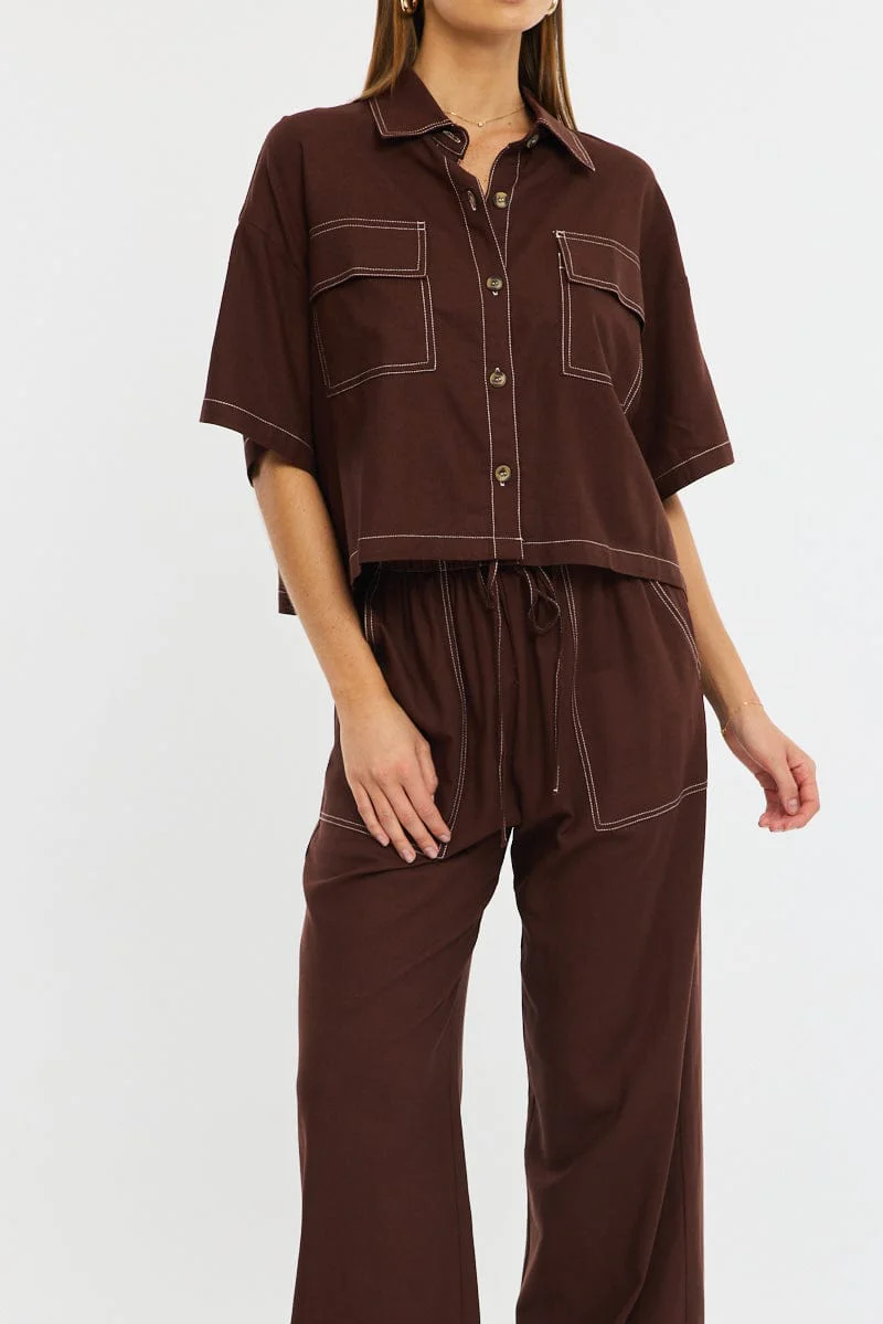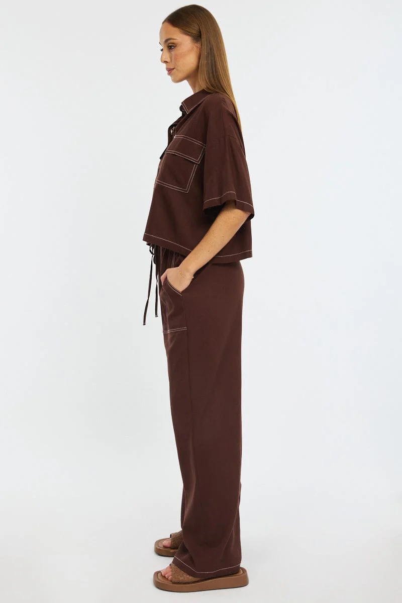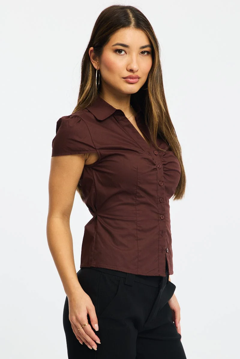 Brown Button Up Shirt Short Sleeve Collared Tie Back