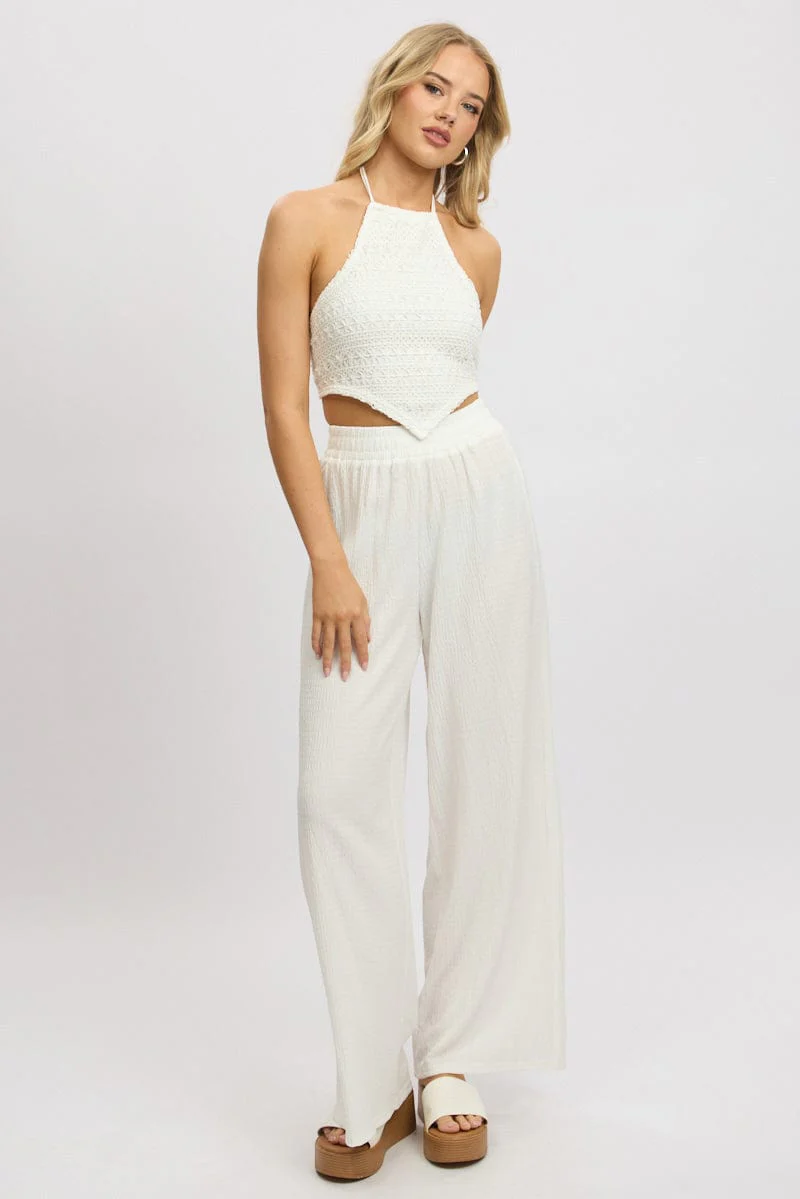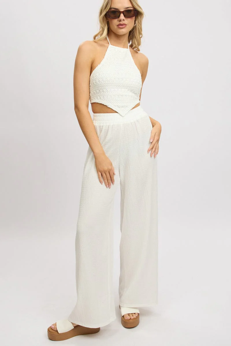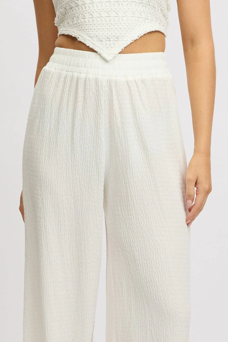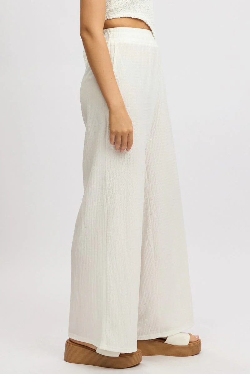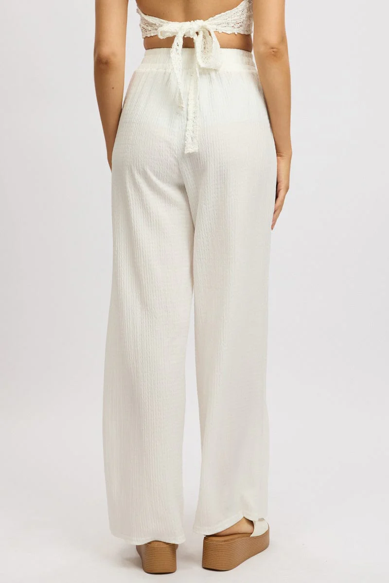 White Wide Leg Pants High Rise Textured Fabric