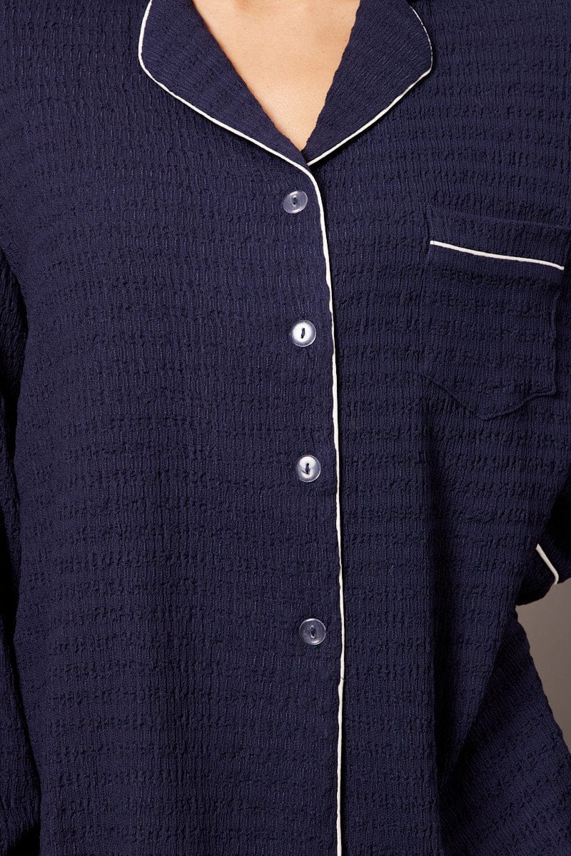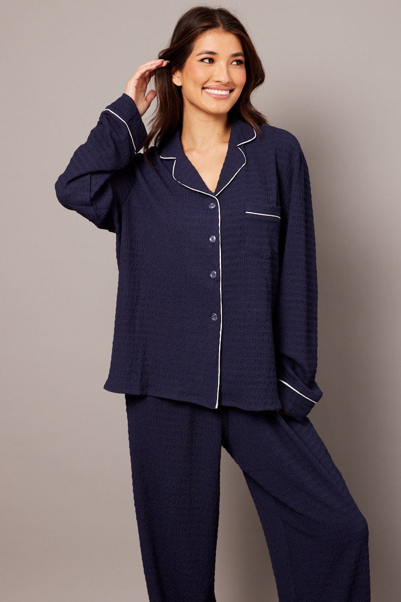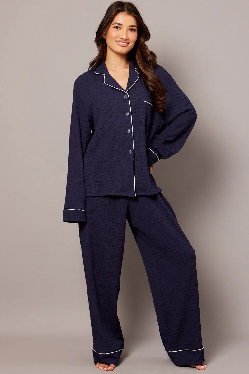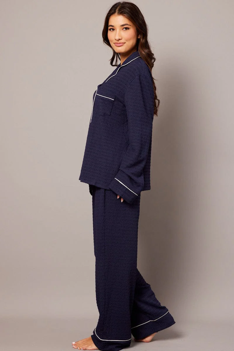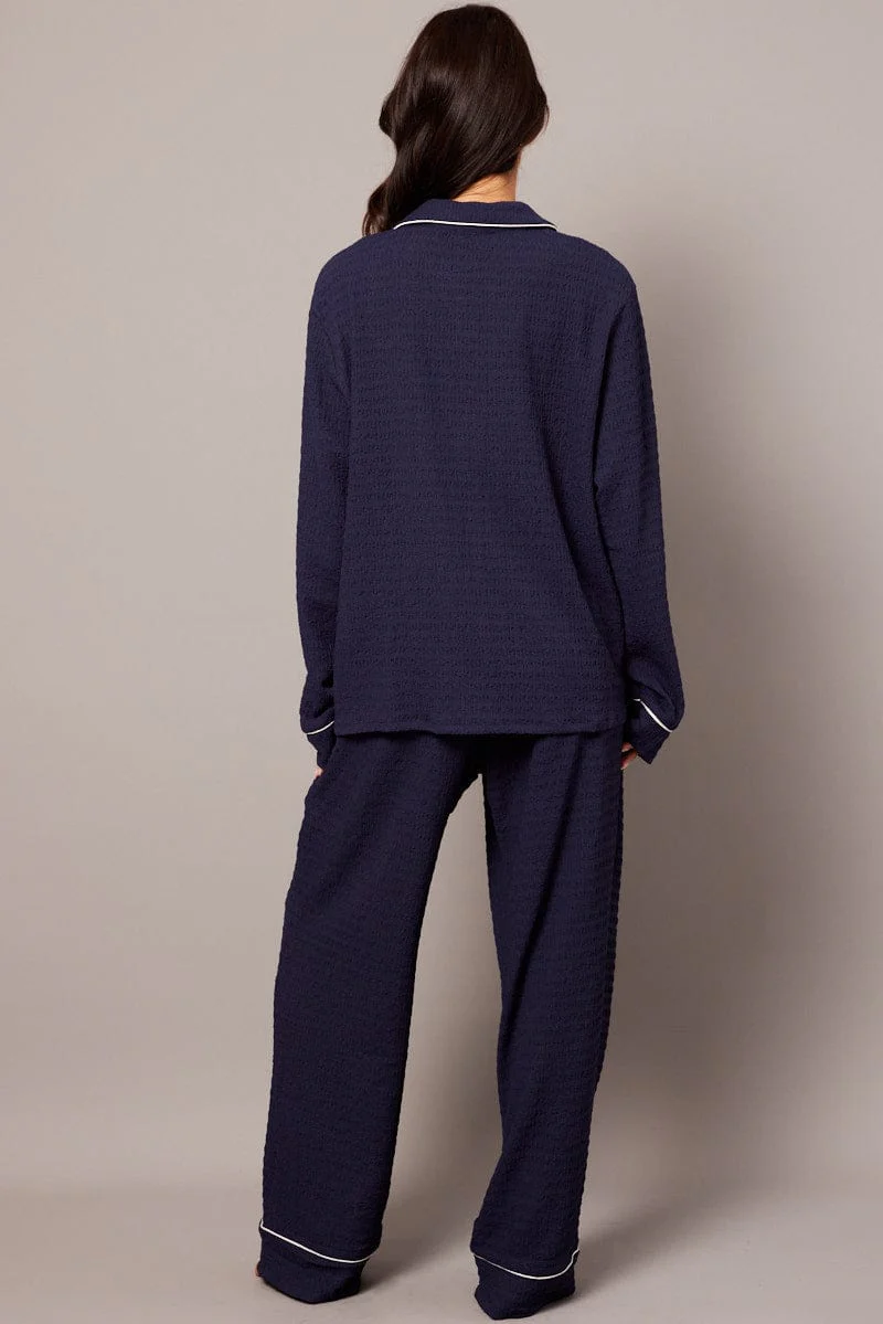 Blue PJ Set Long Leg Contrast Piping Textured Fabric