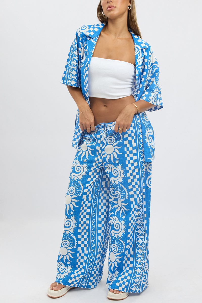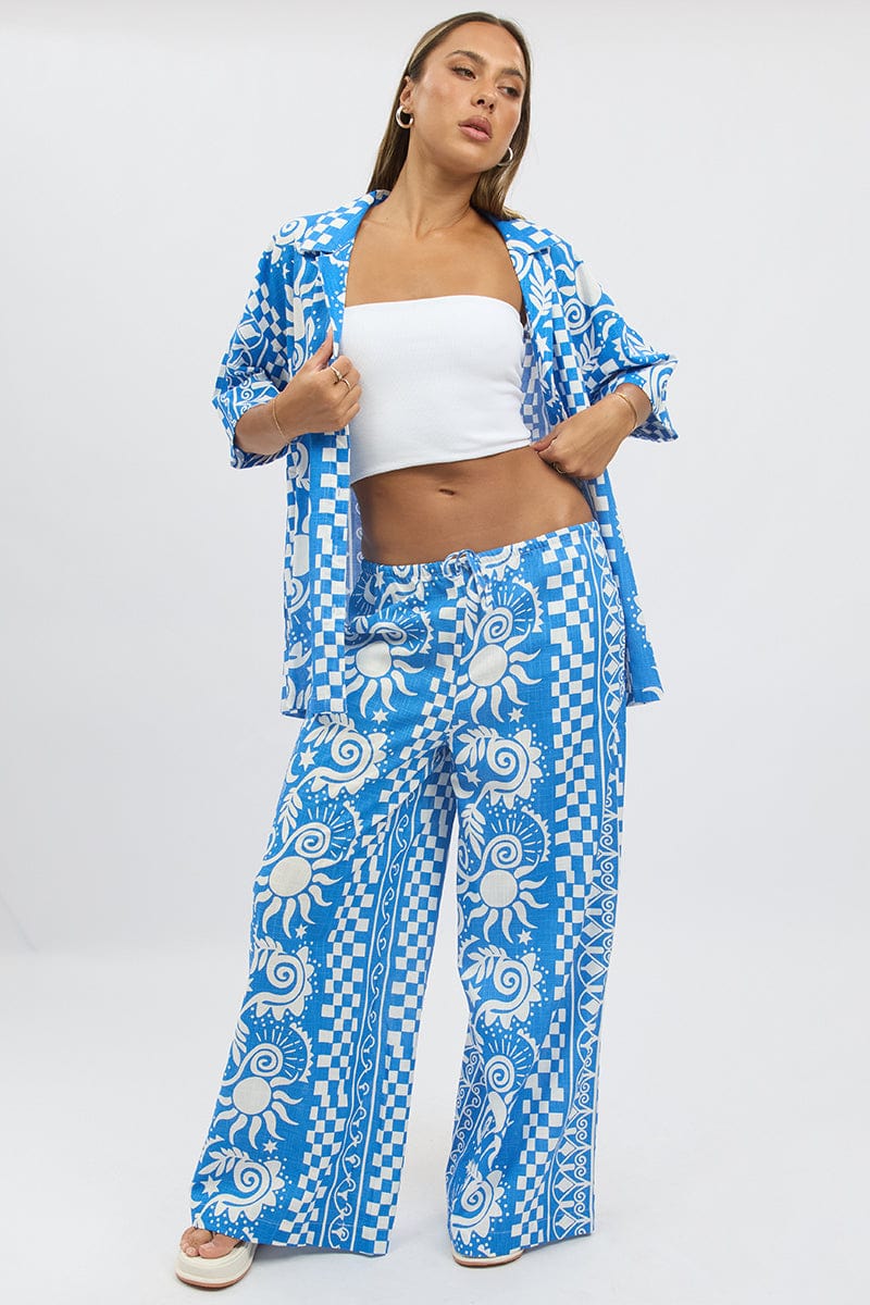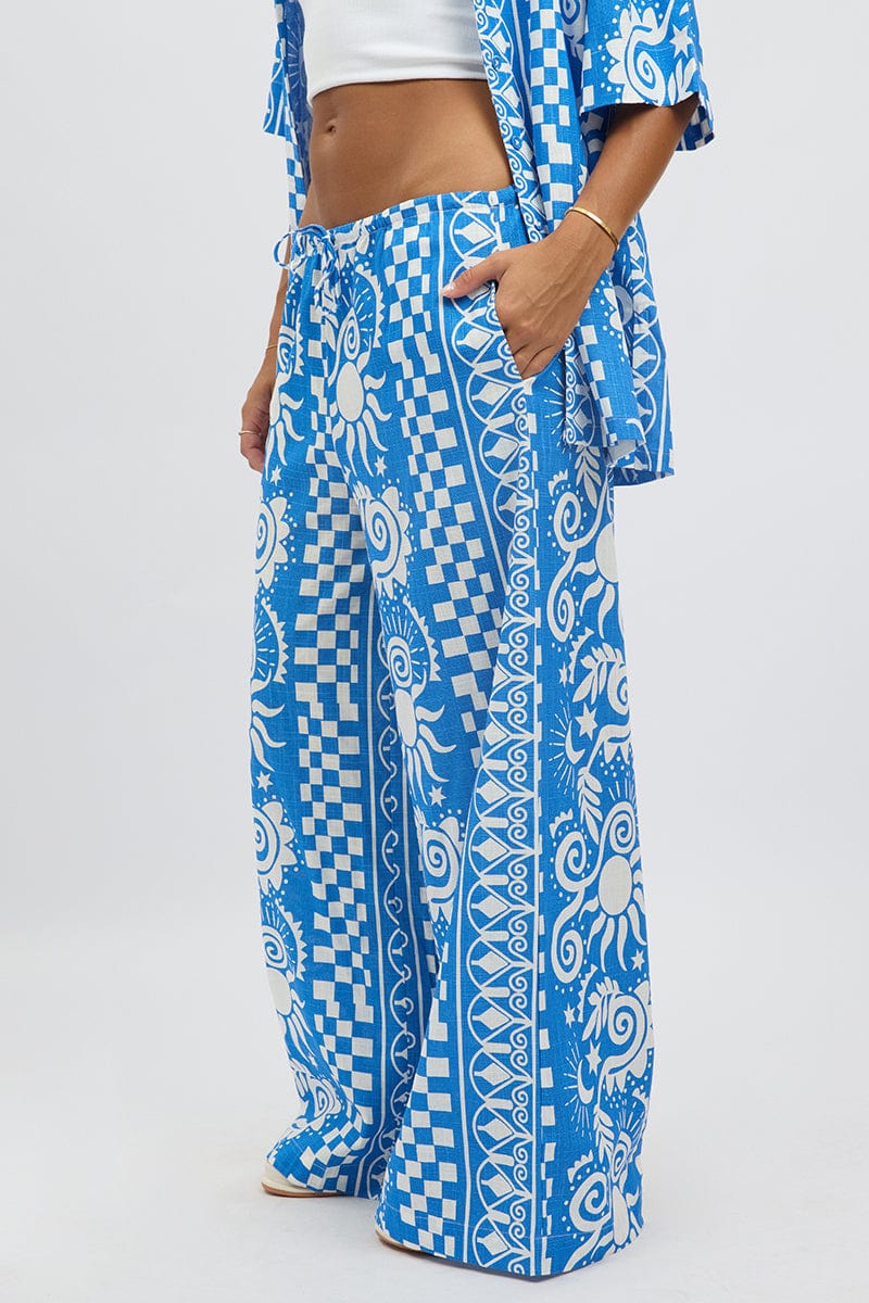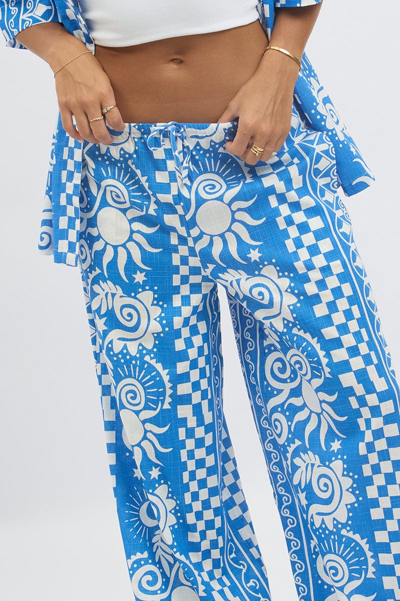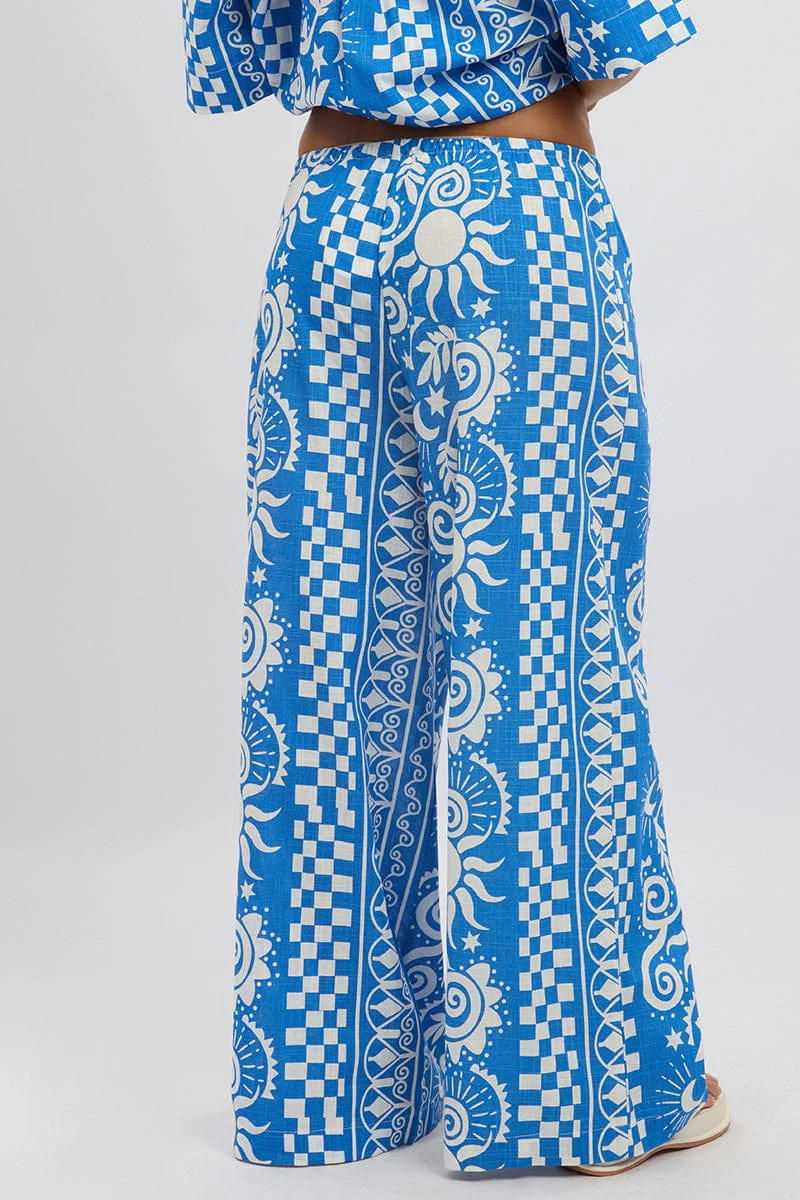 Blue Abstract Wide Leg Pants High Rise