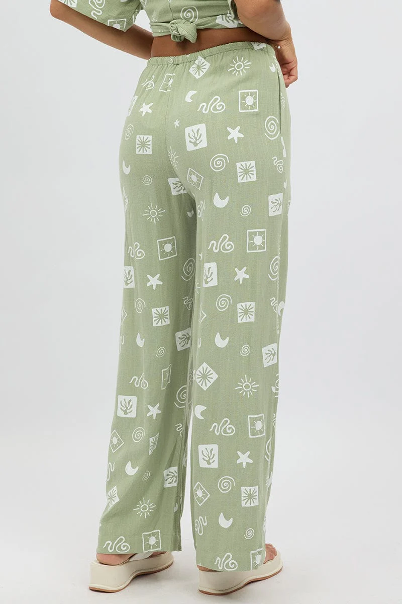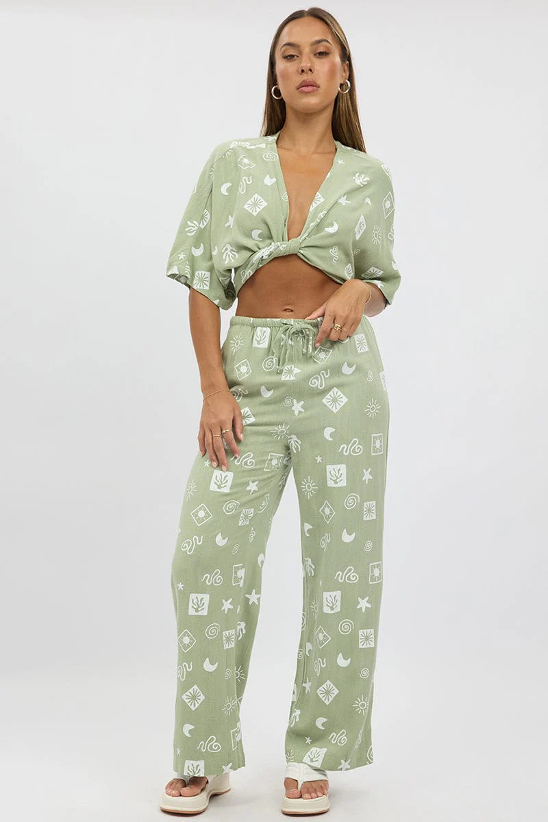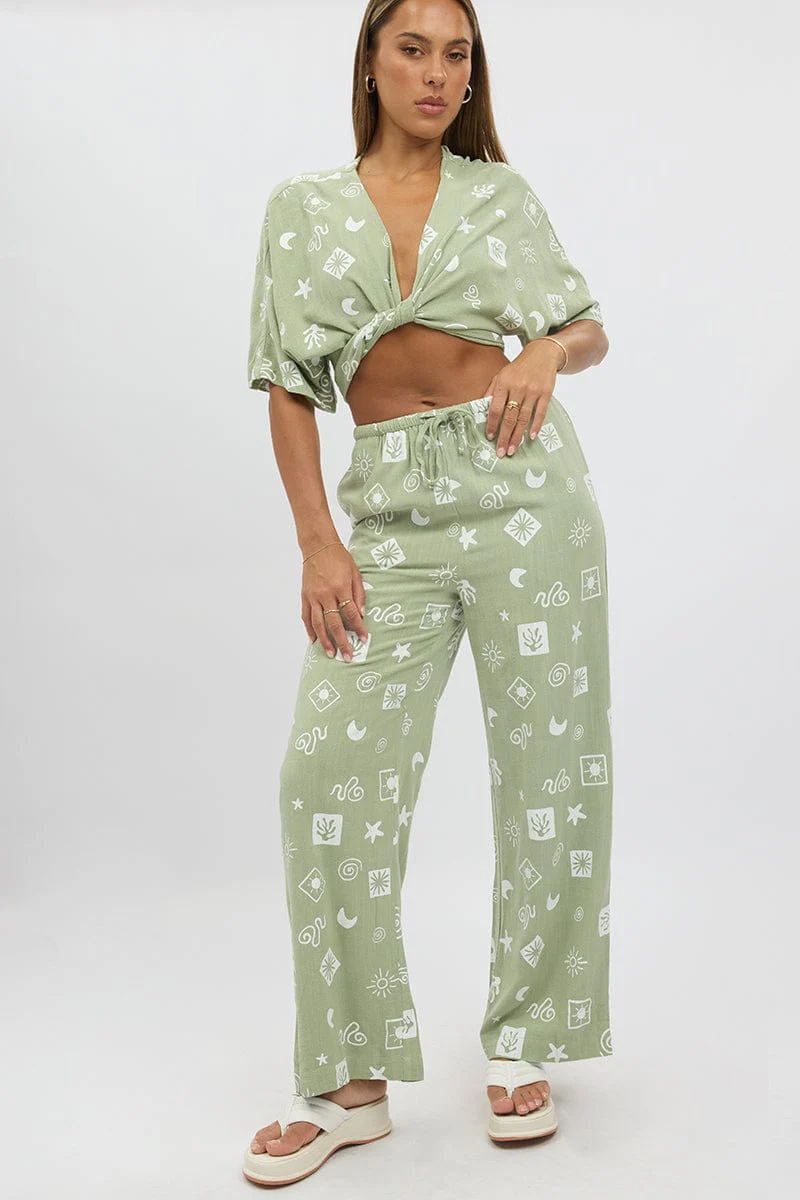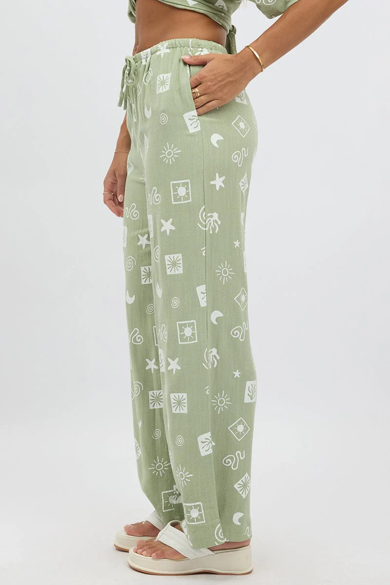 Green Abstract Wide Leg Pants High Rise