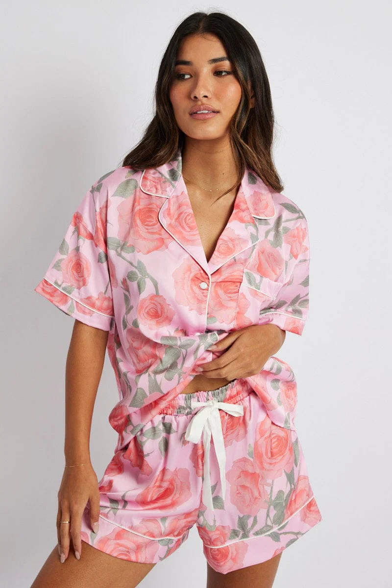 Pink Floral Pyjama Set Satin Short Sleeve Piping PJ