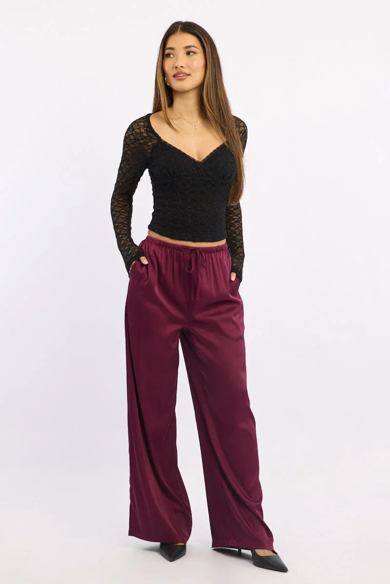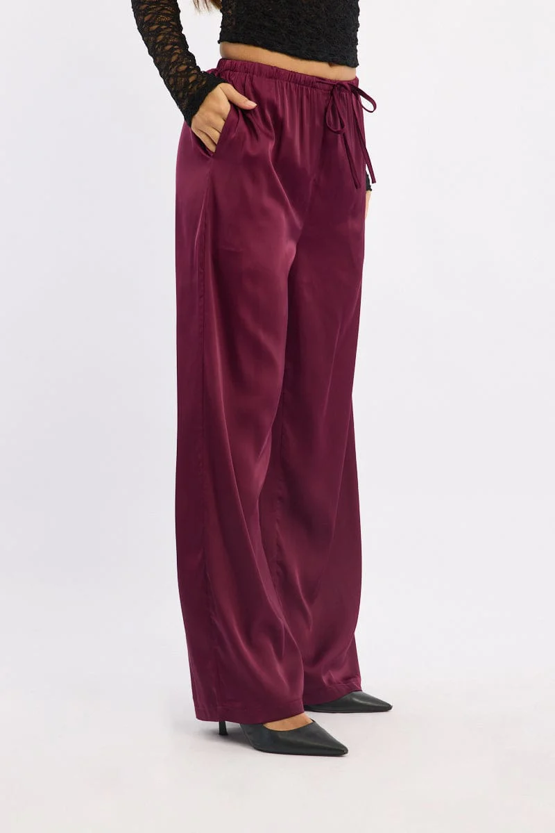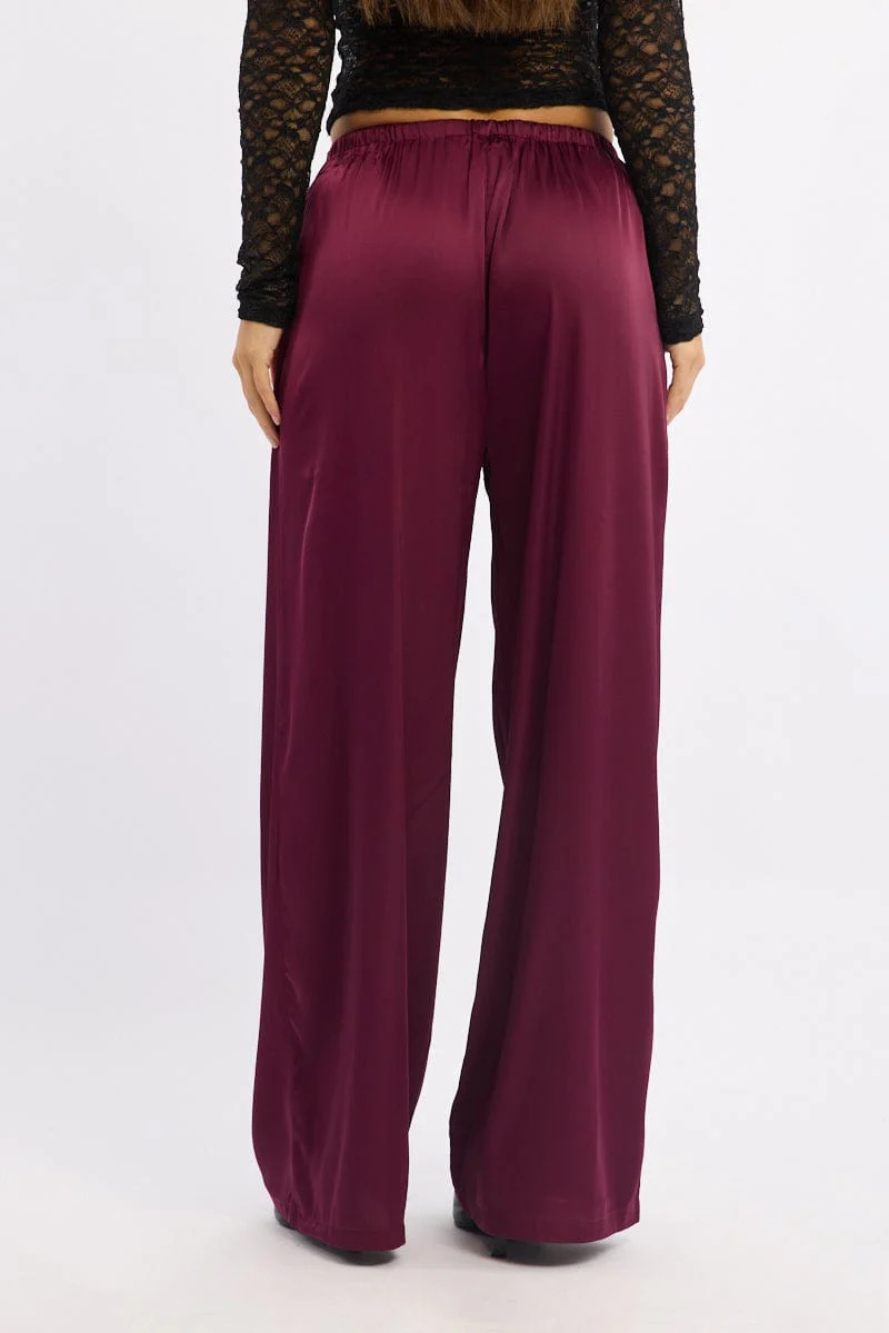 Red Wide Leg Pants High Rise Satin