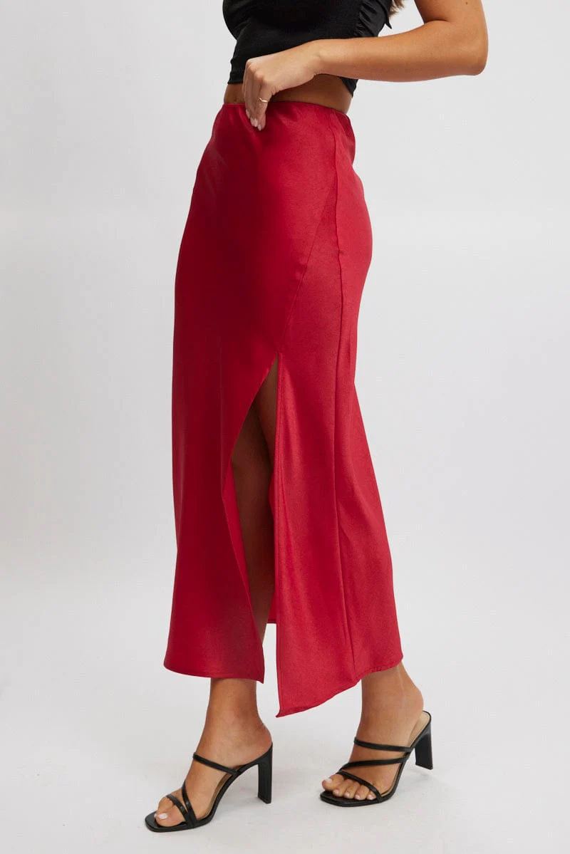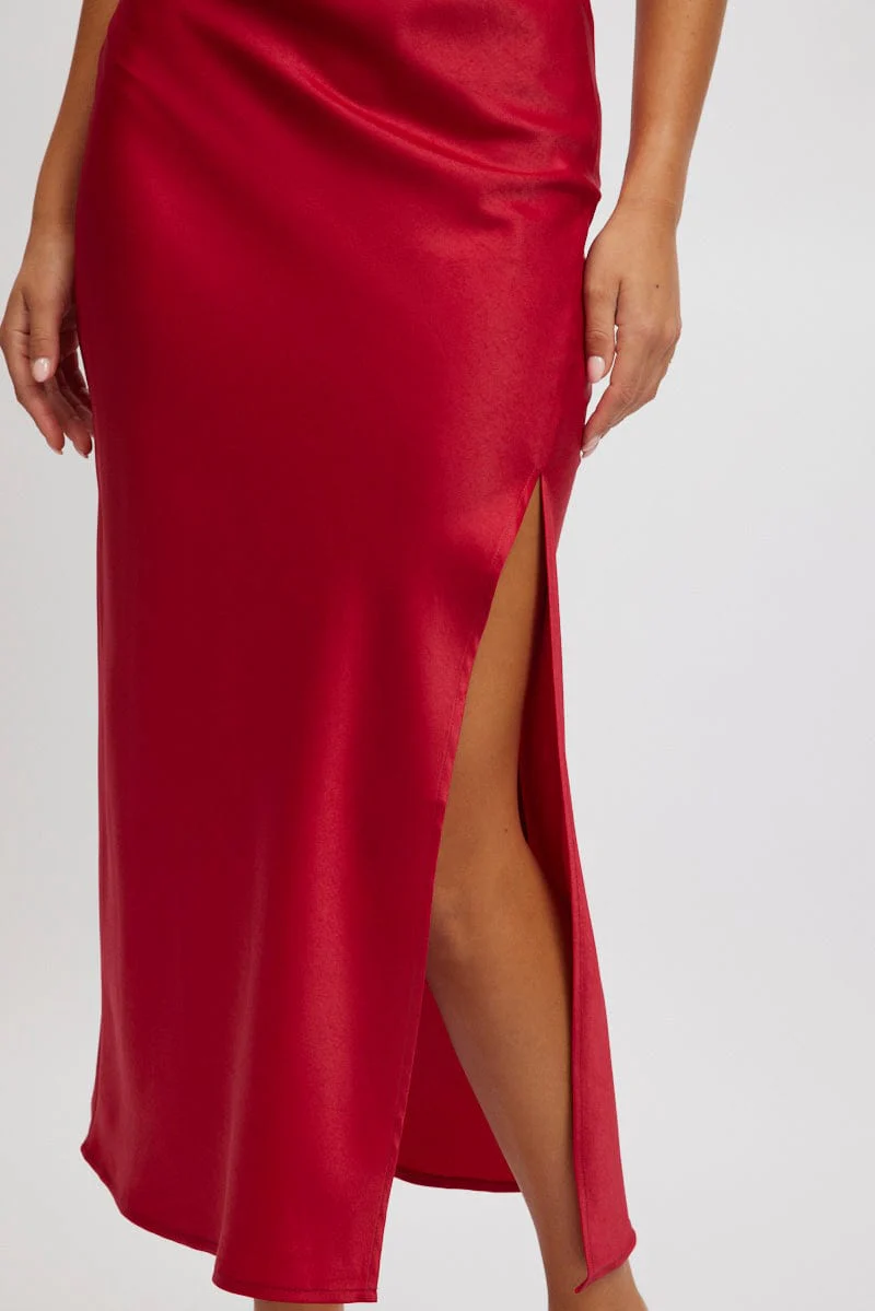 Red Slip Skirt High Waist Front Split Midaxi Satin
