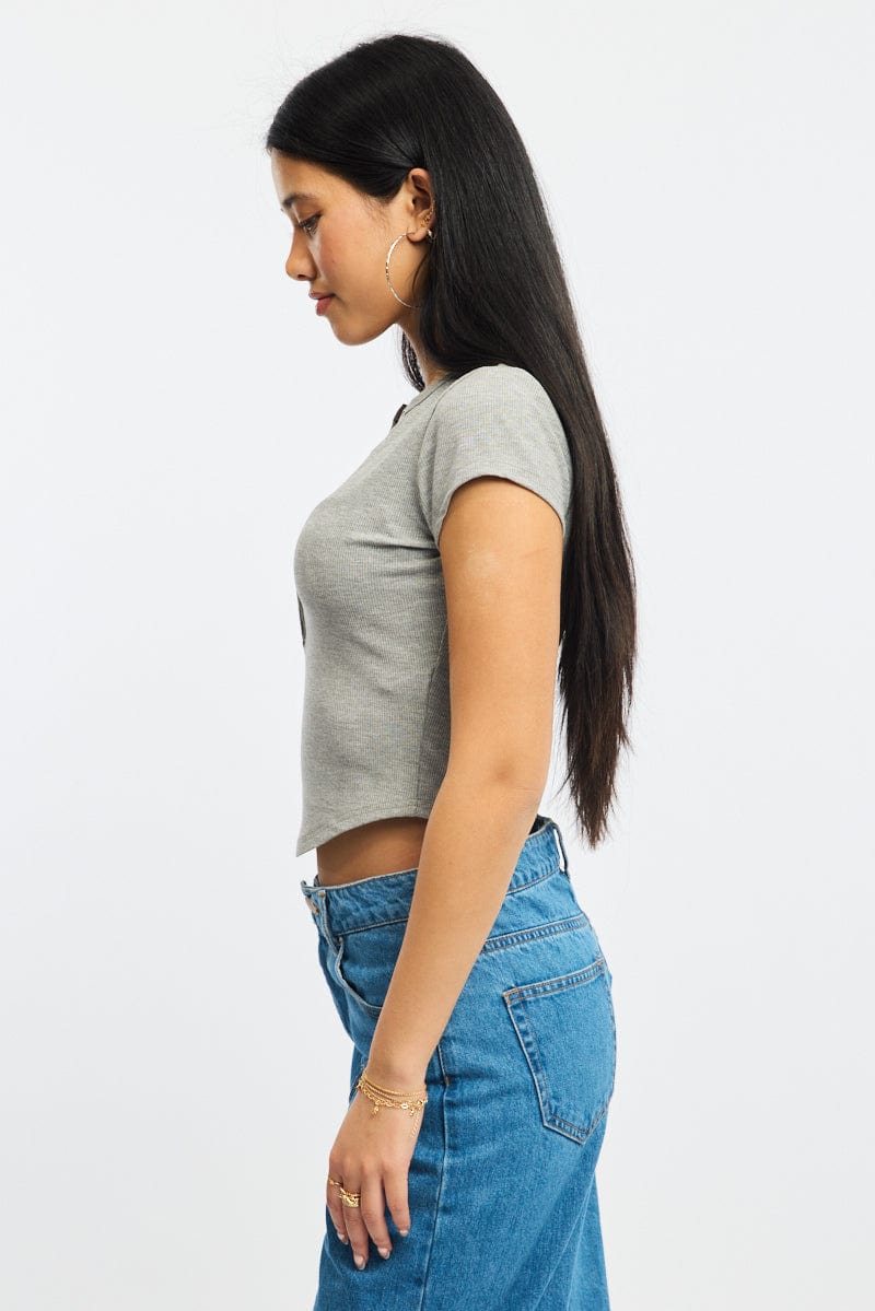 Grey T-shirt Short Sleeve Henley Neck Rib