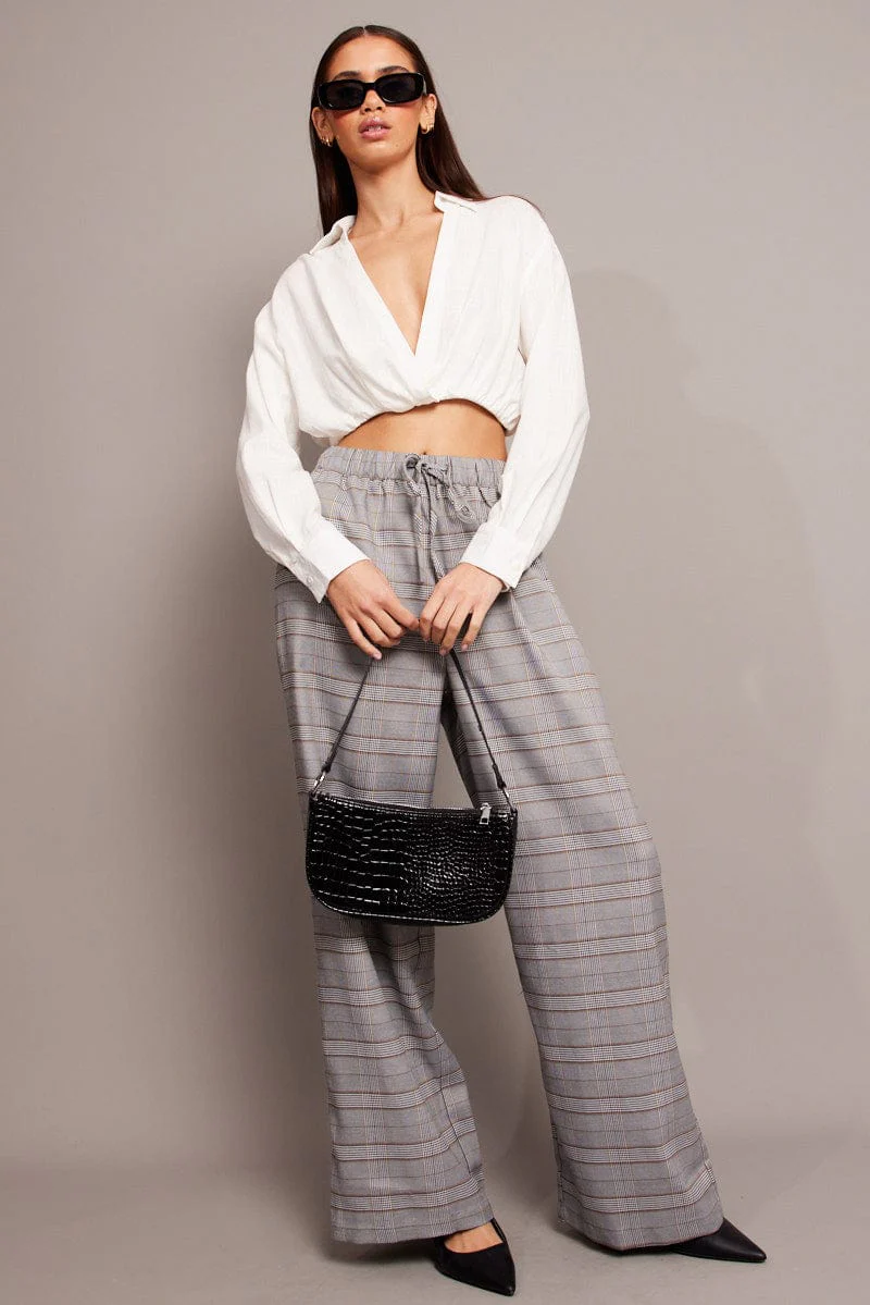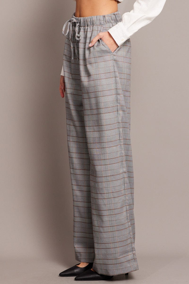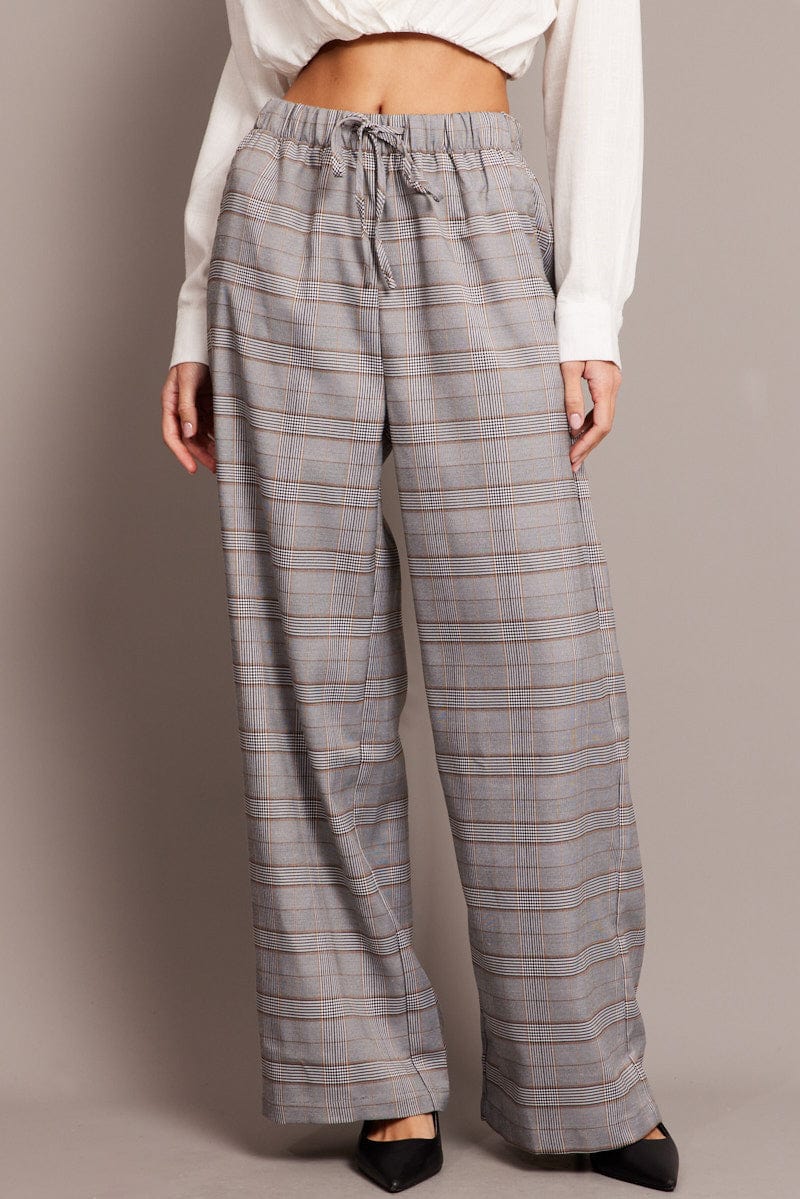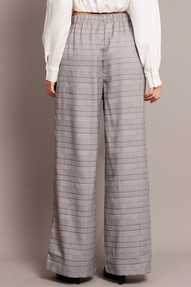 Grey Check Wide Leg Pants Elastic Waist