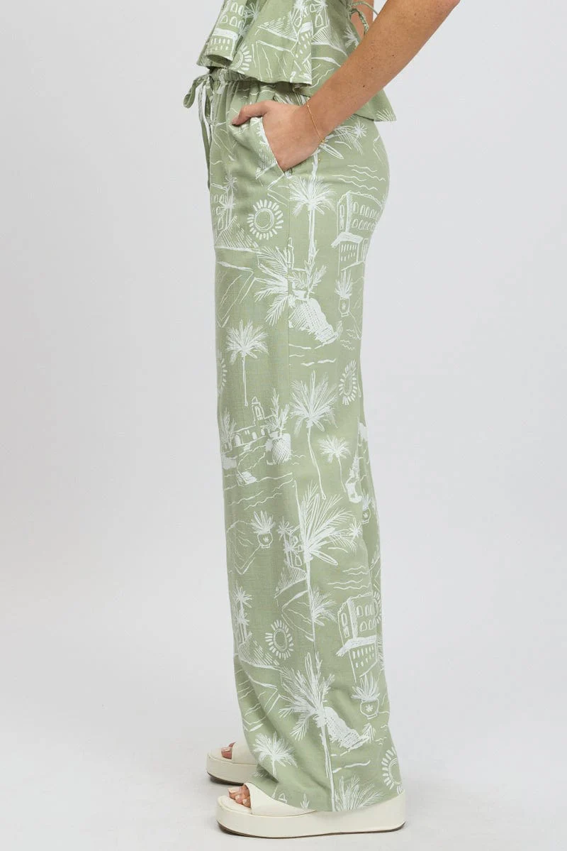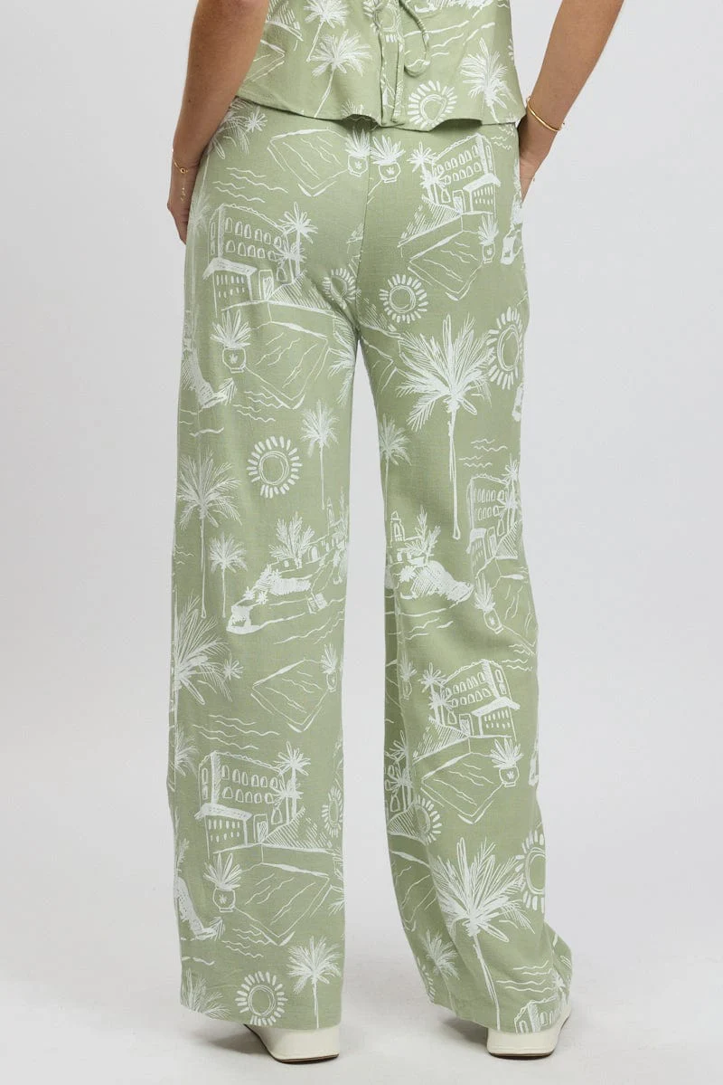 Green Abstract Wide Leg Pants High Rise