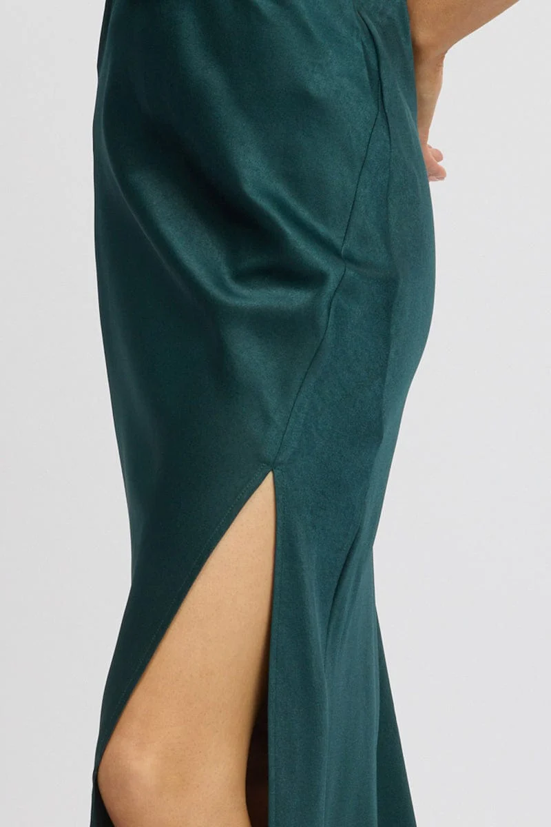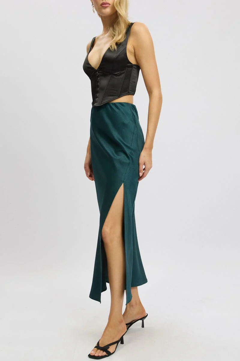 Green Slip Skirt High Waist Front Split Midaxi Satin