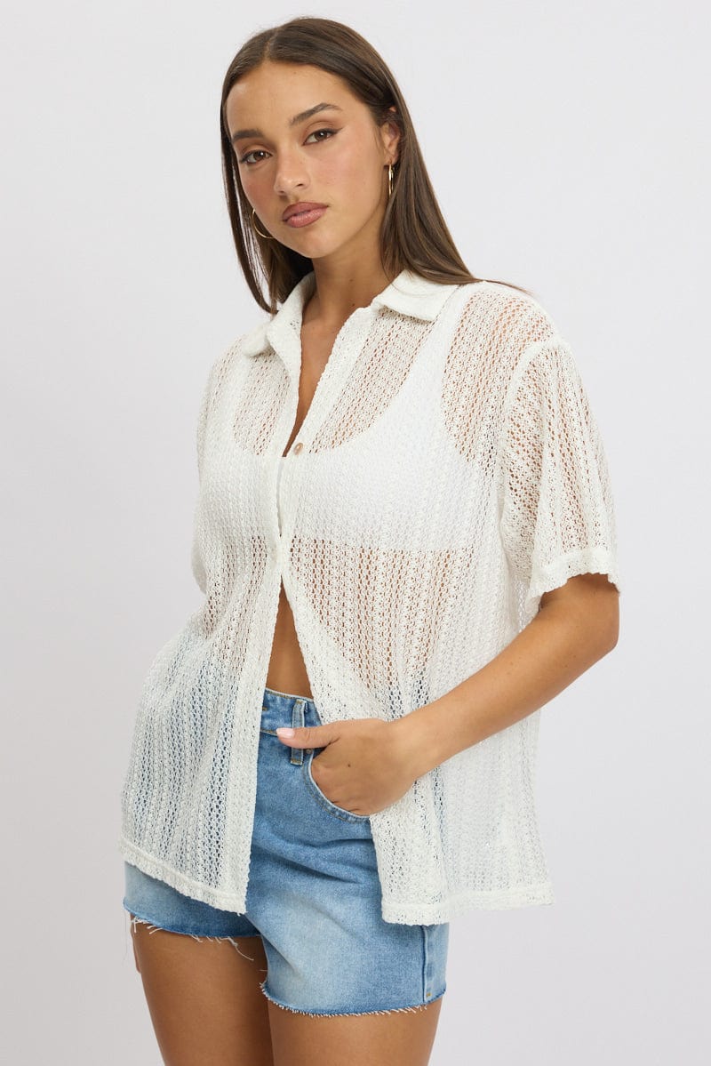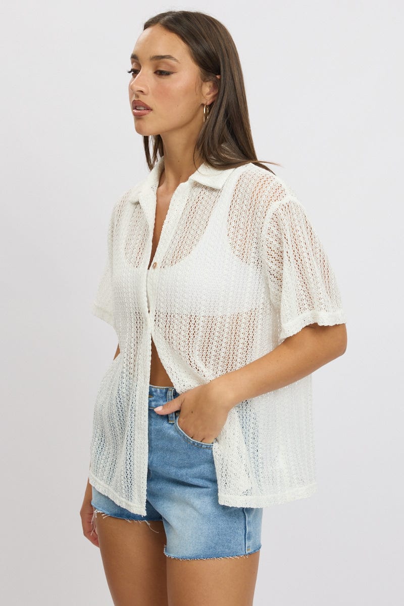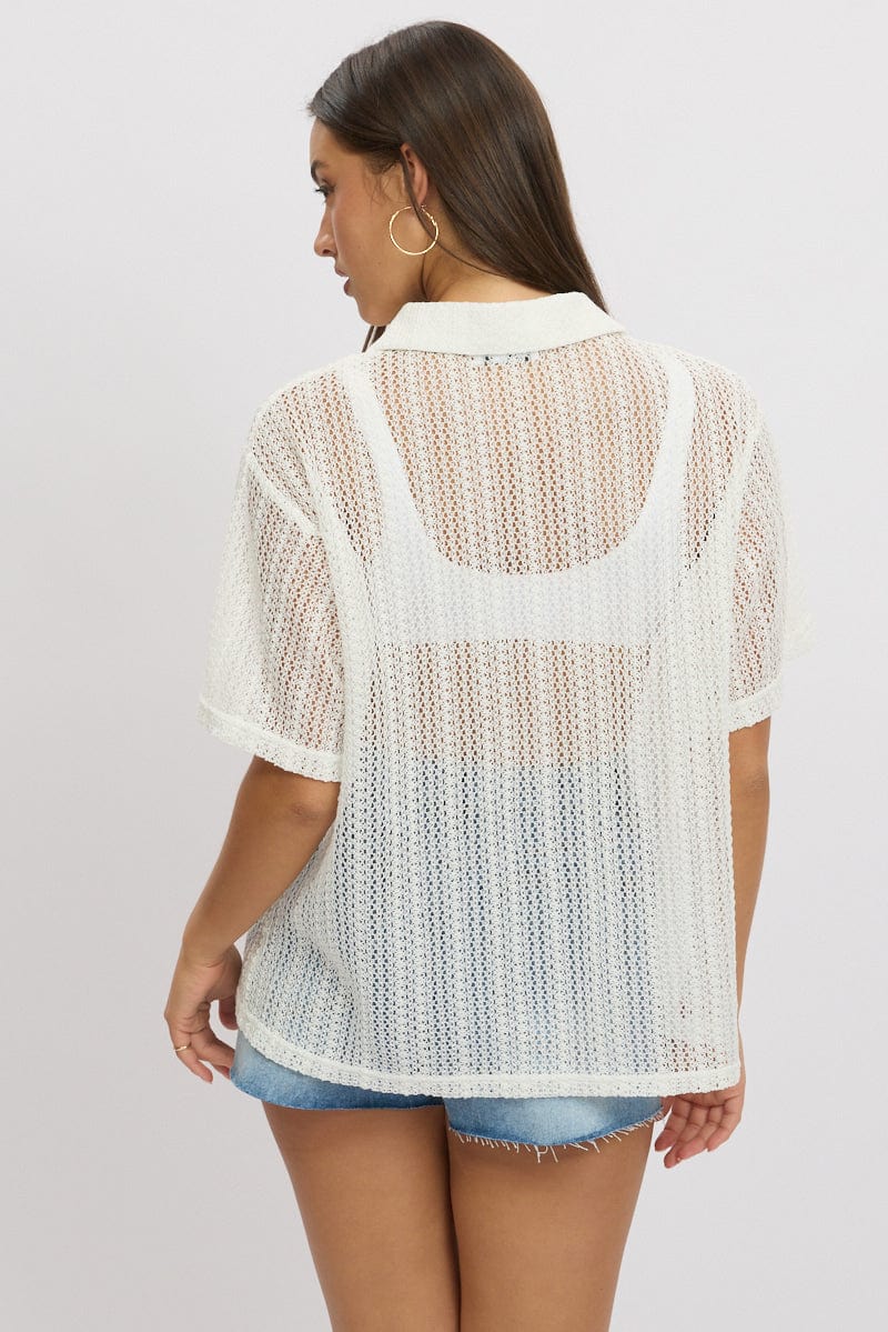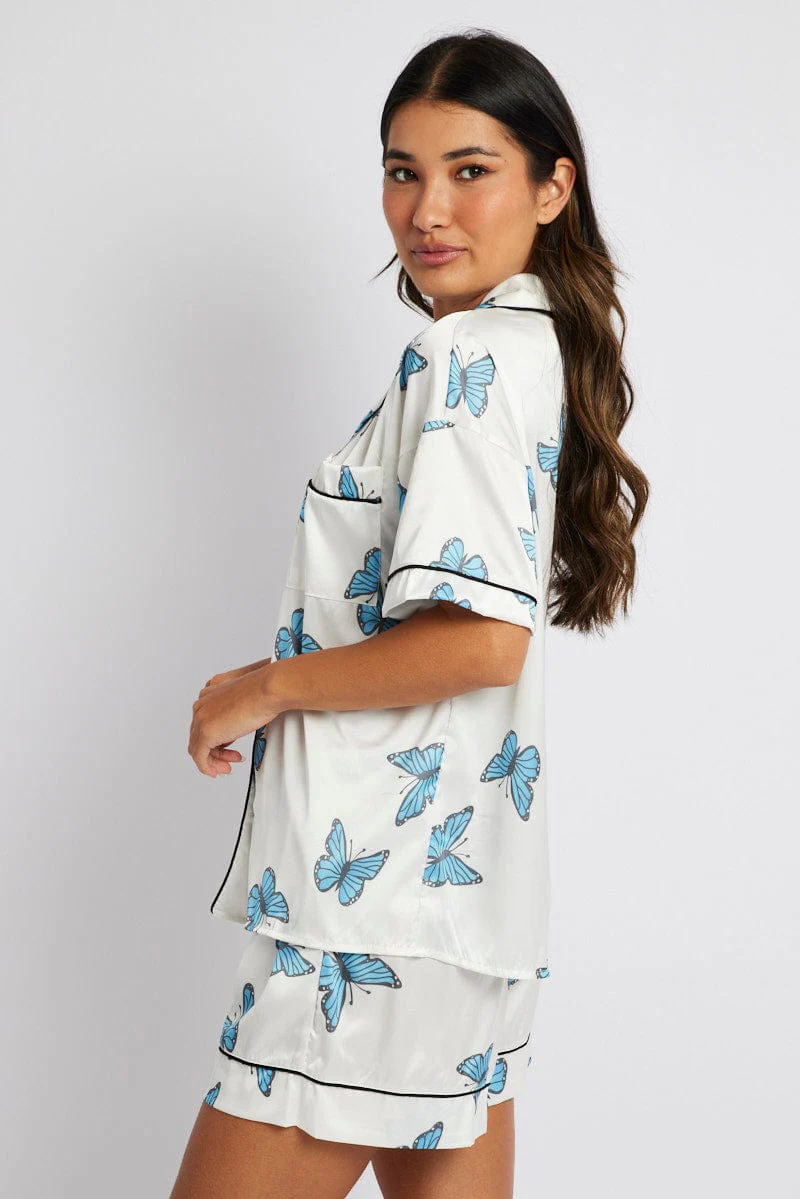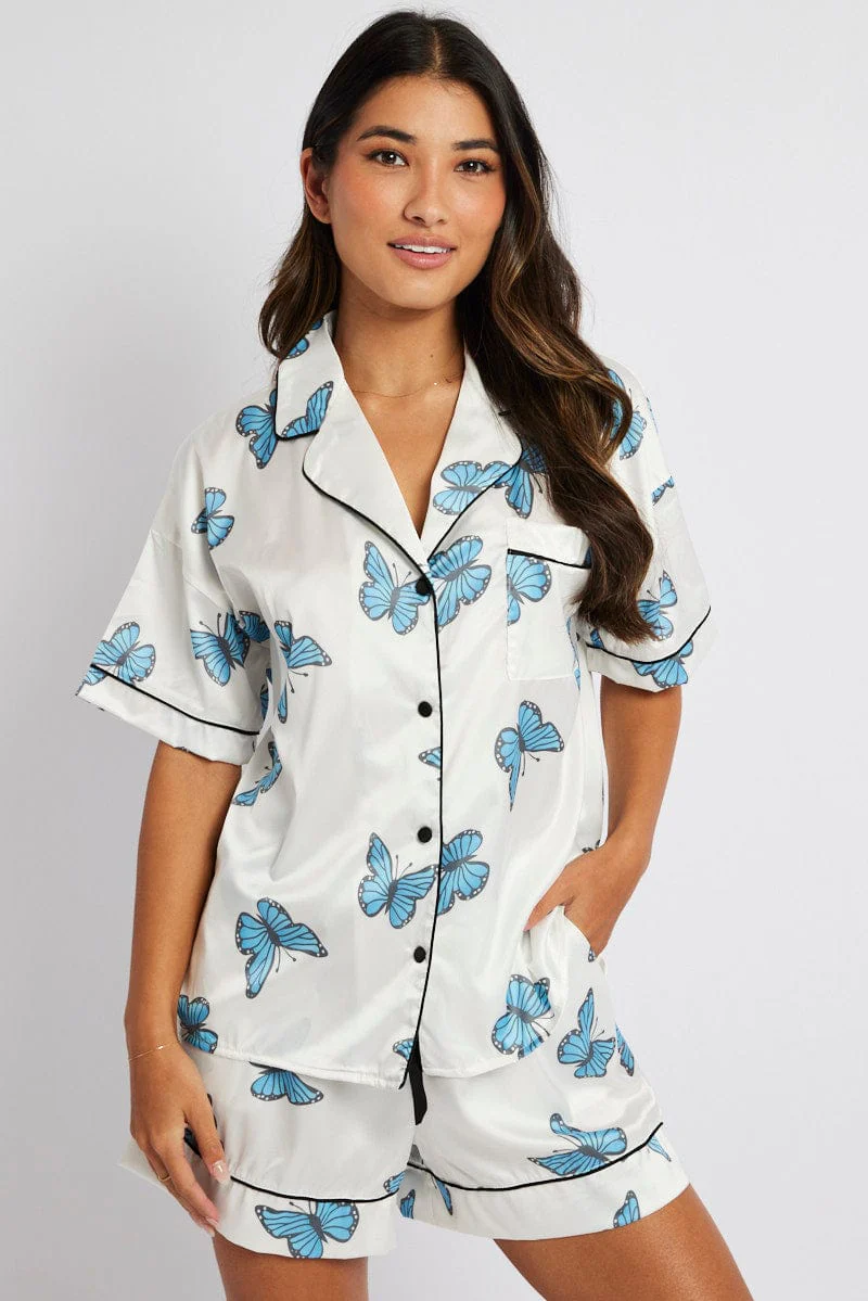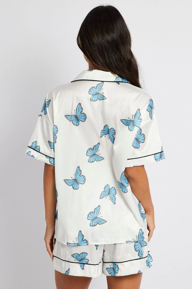 White Print Butterfly Pyjama Set Short Sleeve Piping Satin PJ