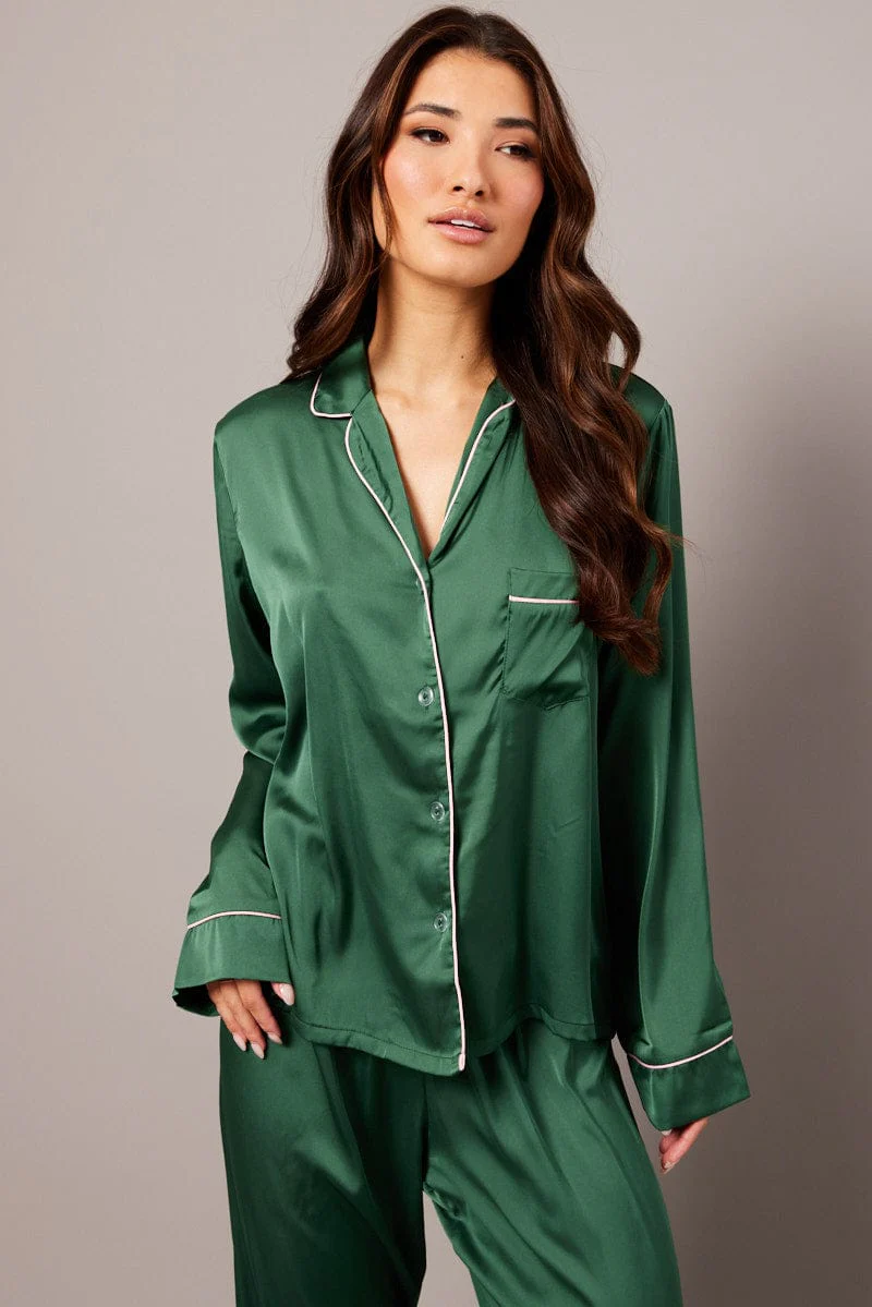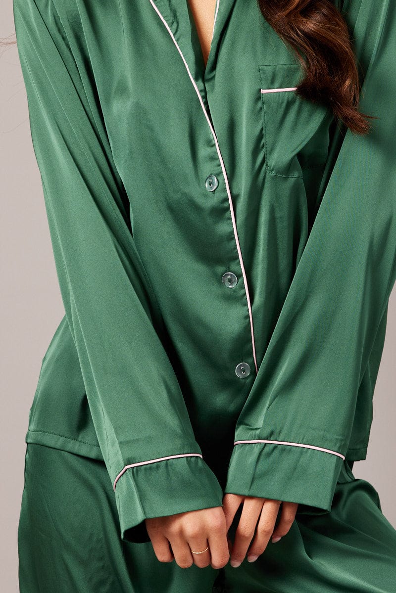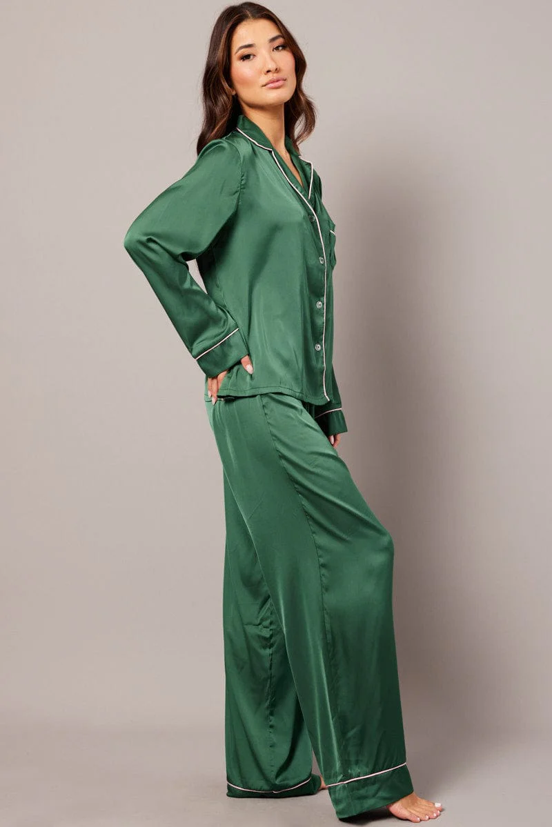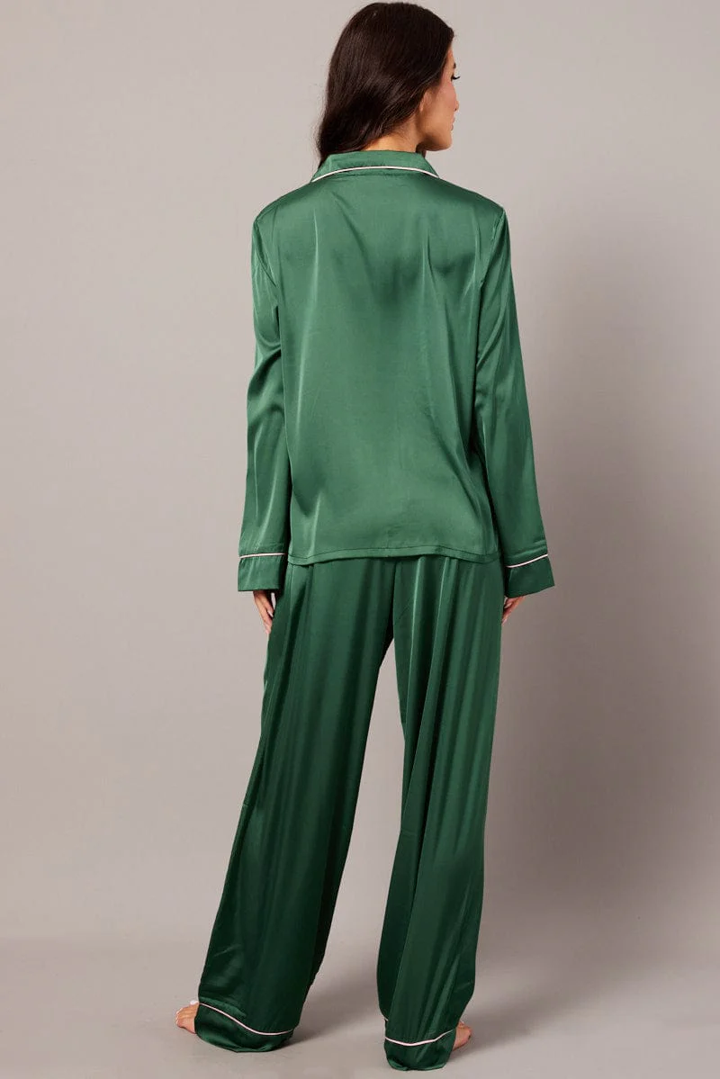 Green Satin Pyjama Contrast Piping Long Leg Pj Set