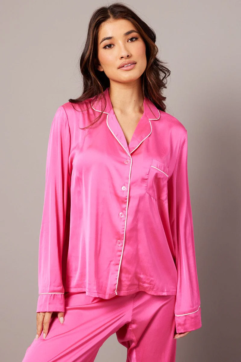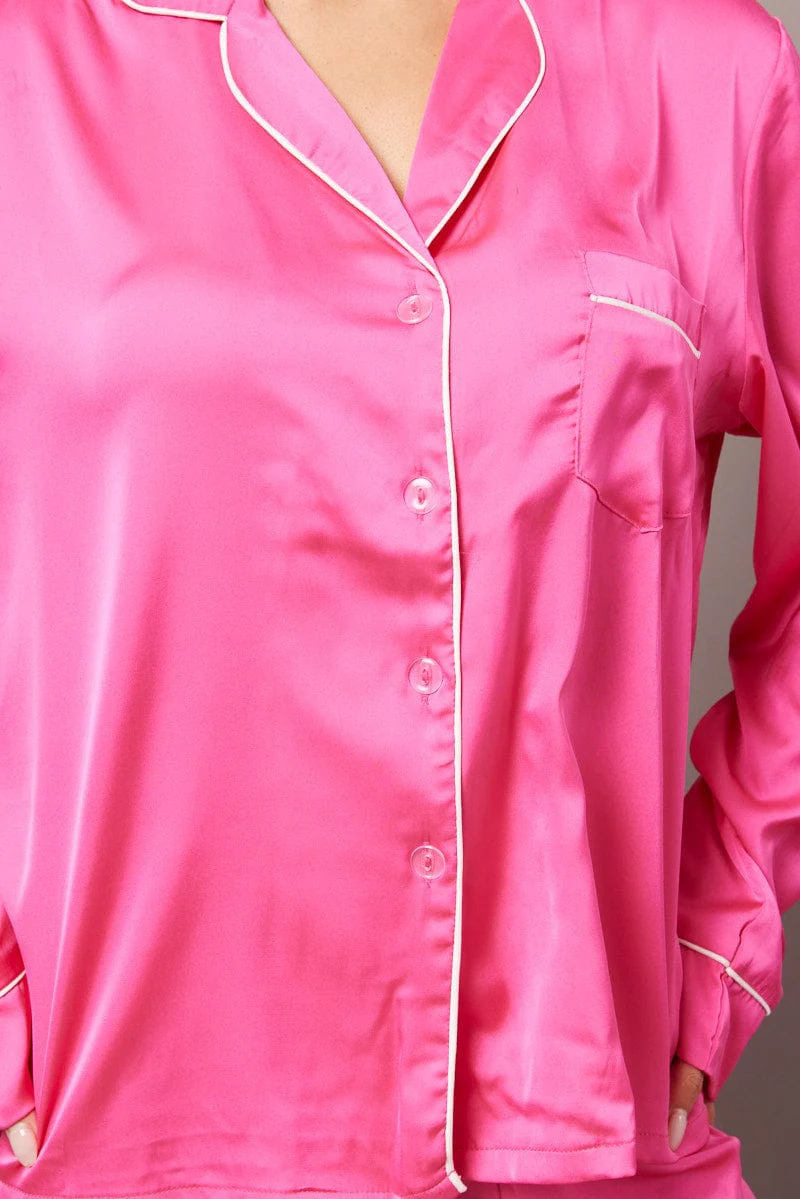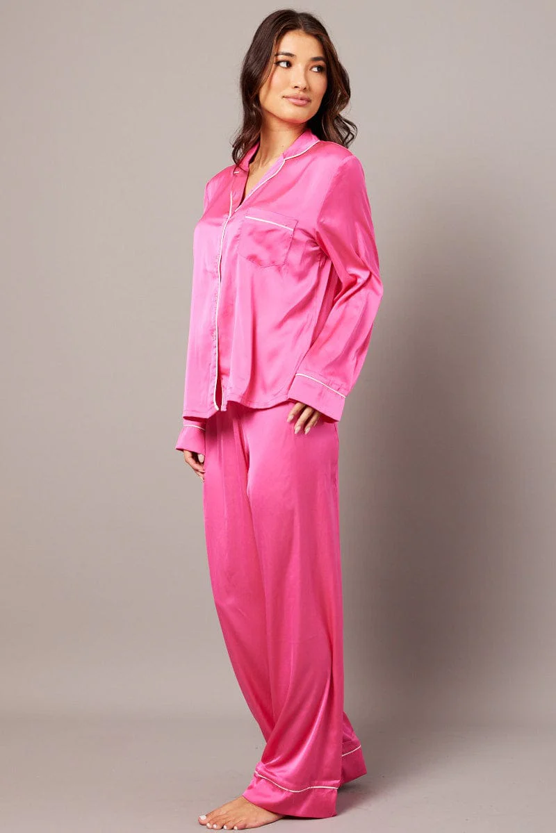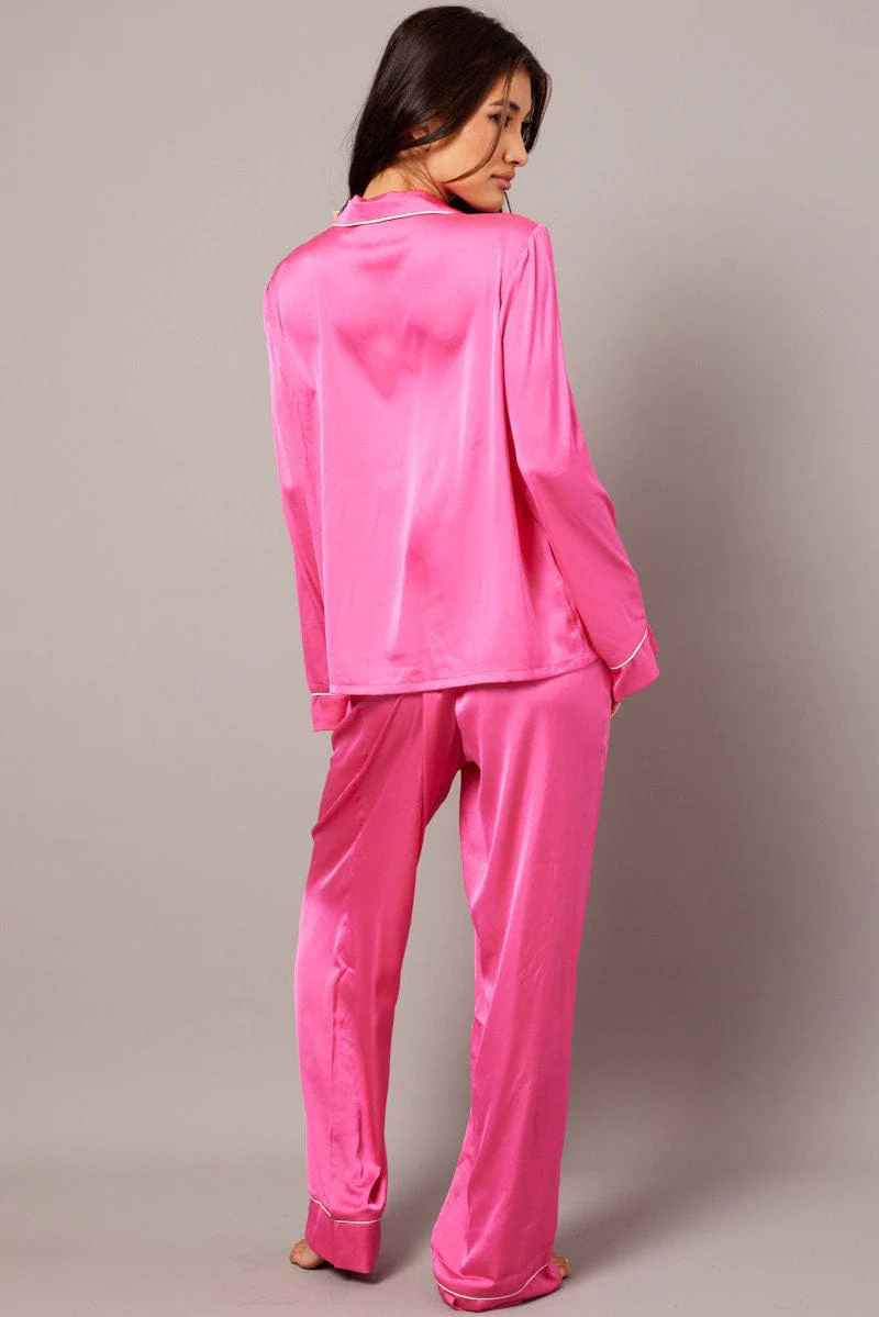 Pink Satin Pyjama Contrast Piping Long Leg Pj Set