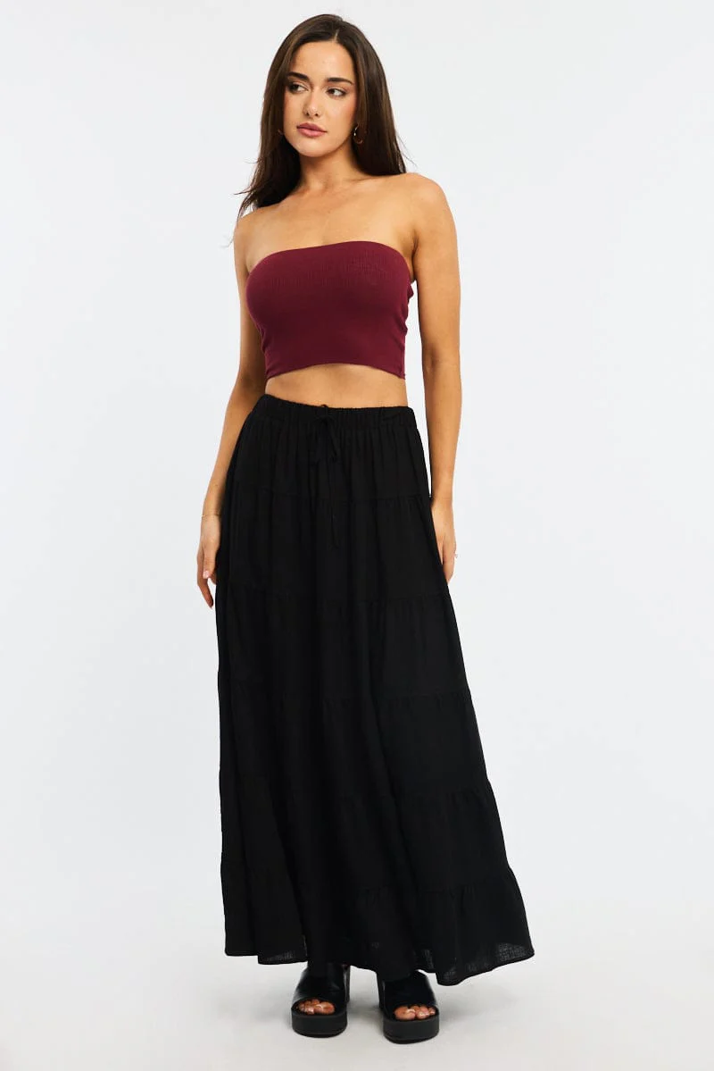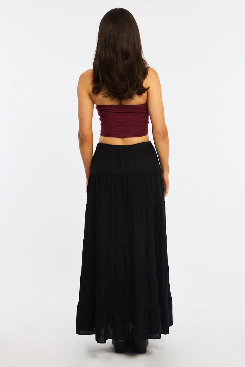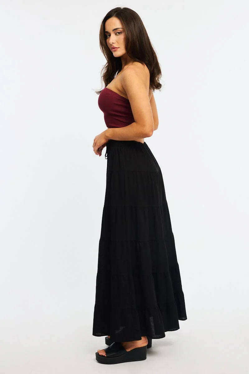 Black Maxi Skirt Tiered High Rise Linen Blend