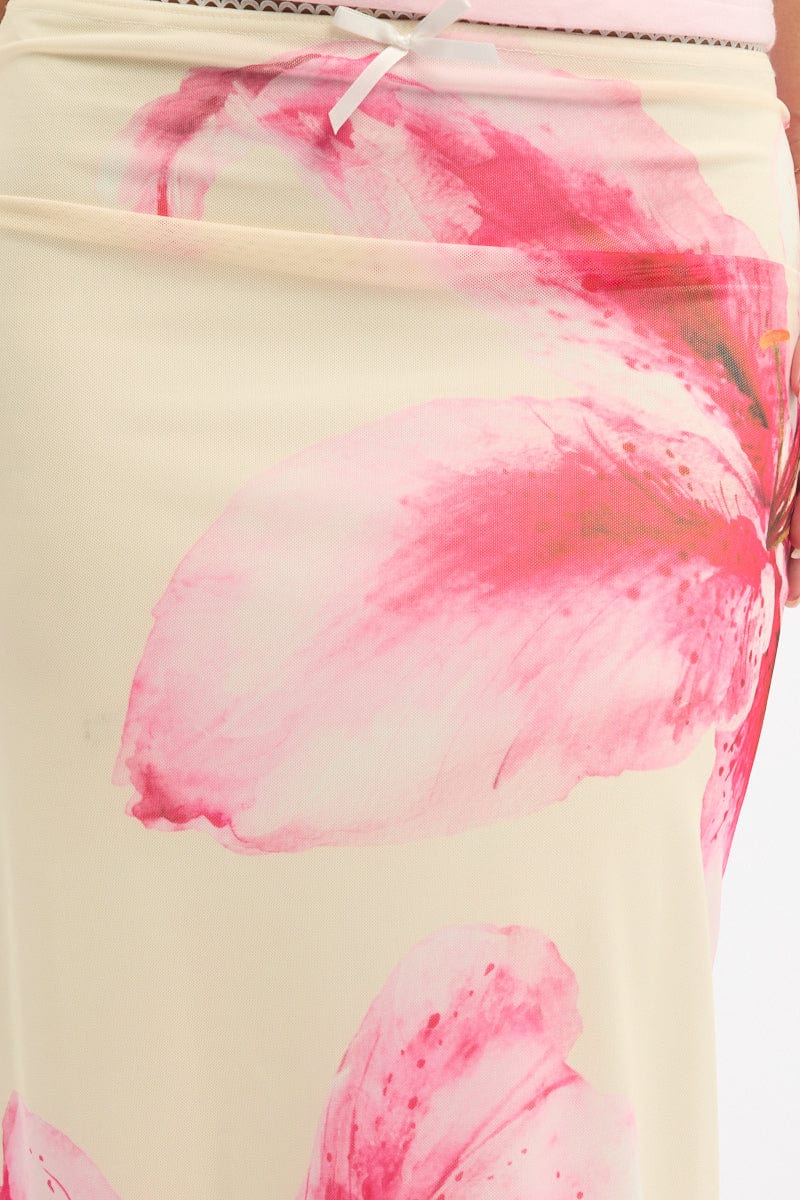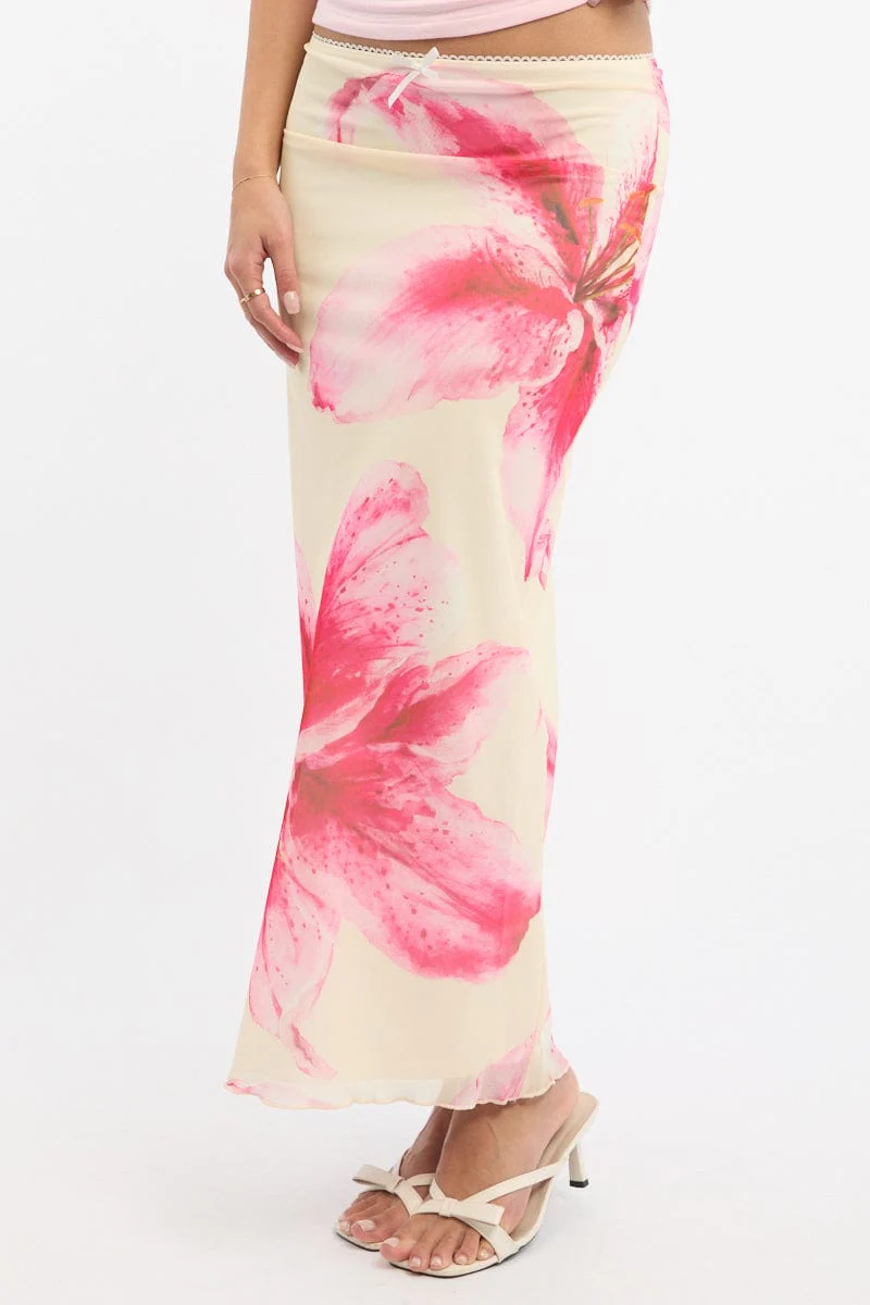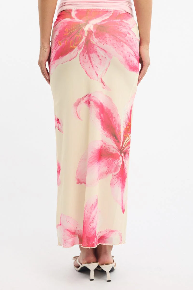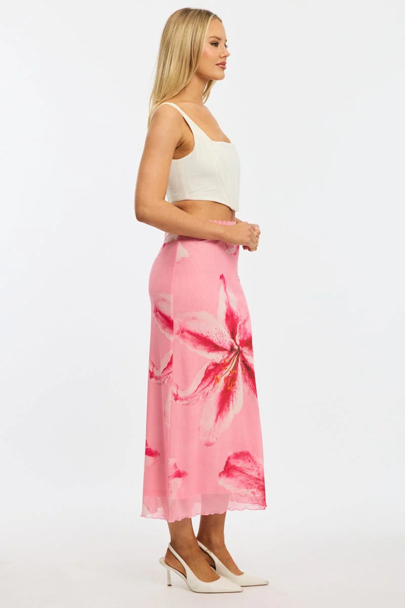 Pink Floral Mesh Skirt Elasticated Lace Trim Midaxi