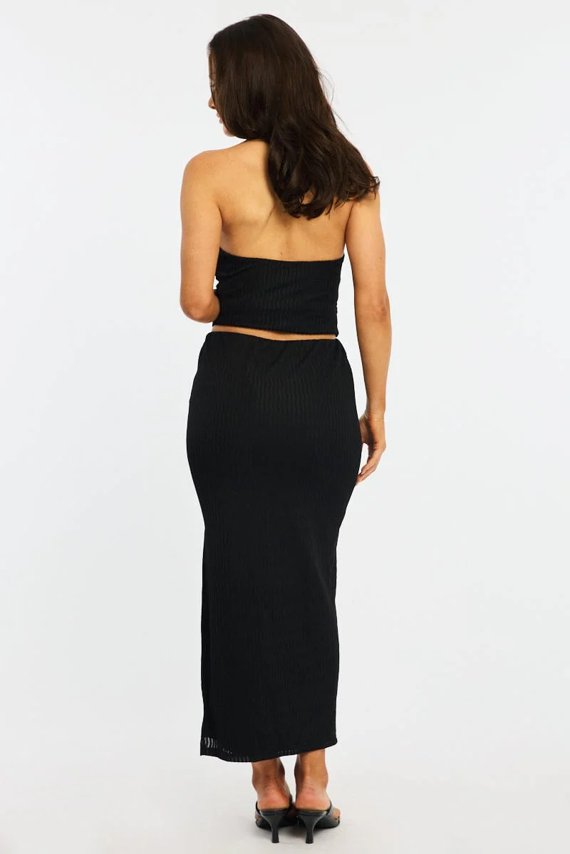 Black Maxi Skirt Elasticated Waist Side Split Textured