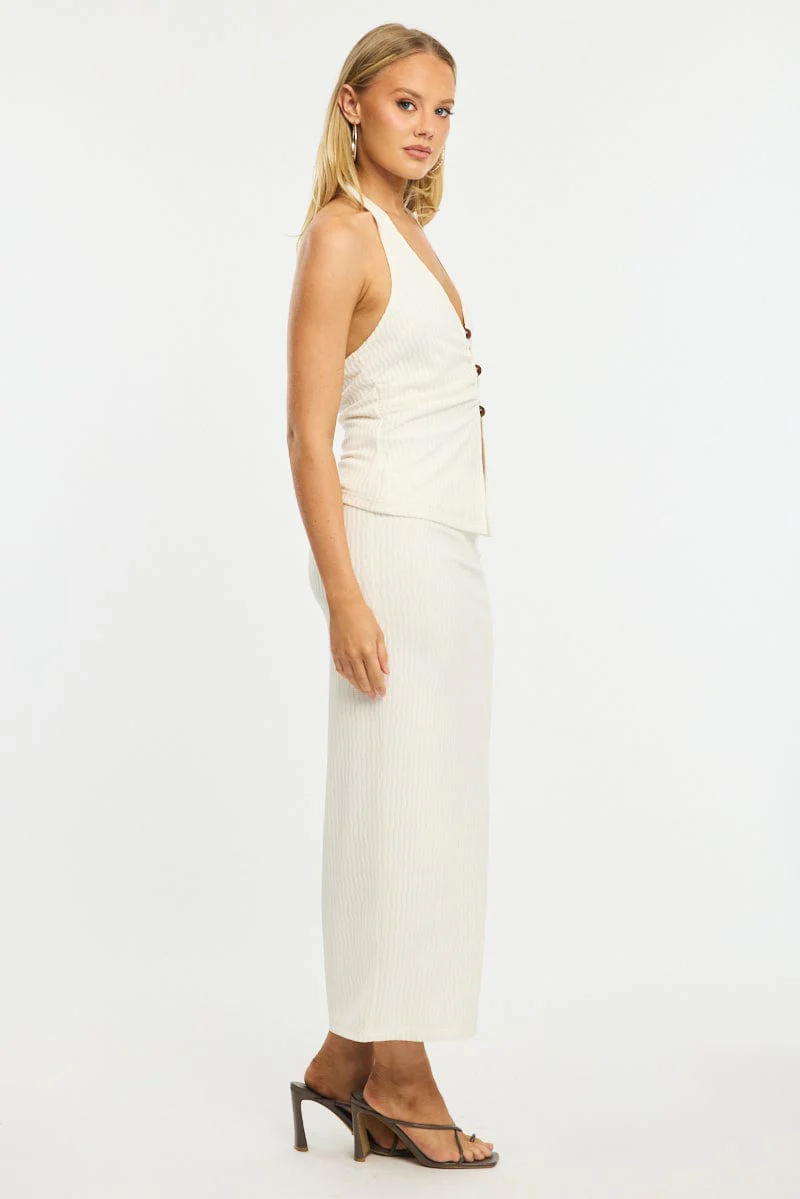 White Maxi Skirt Elasticated Waist Side Split Textured