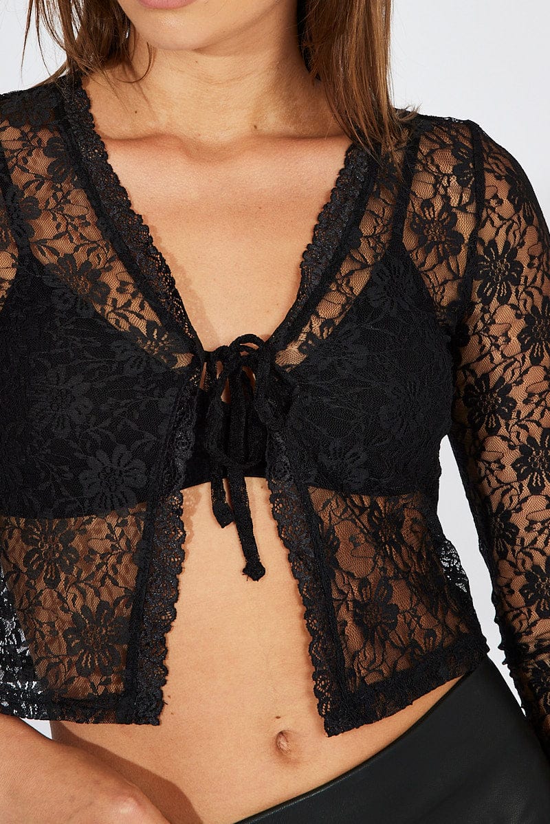 Black Lace Top Tie Front Long Sleeve