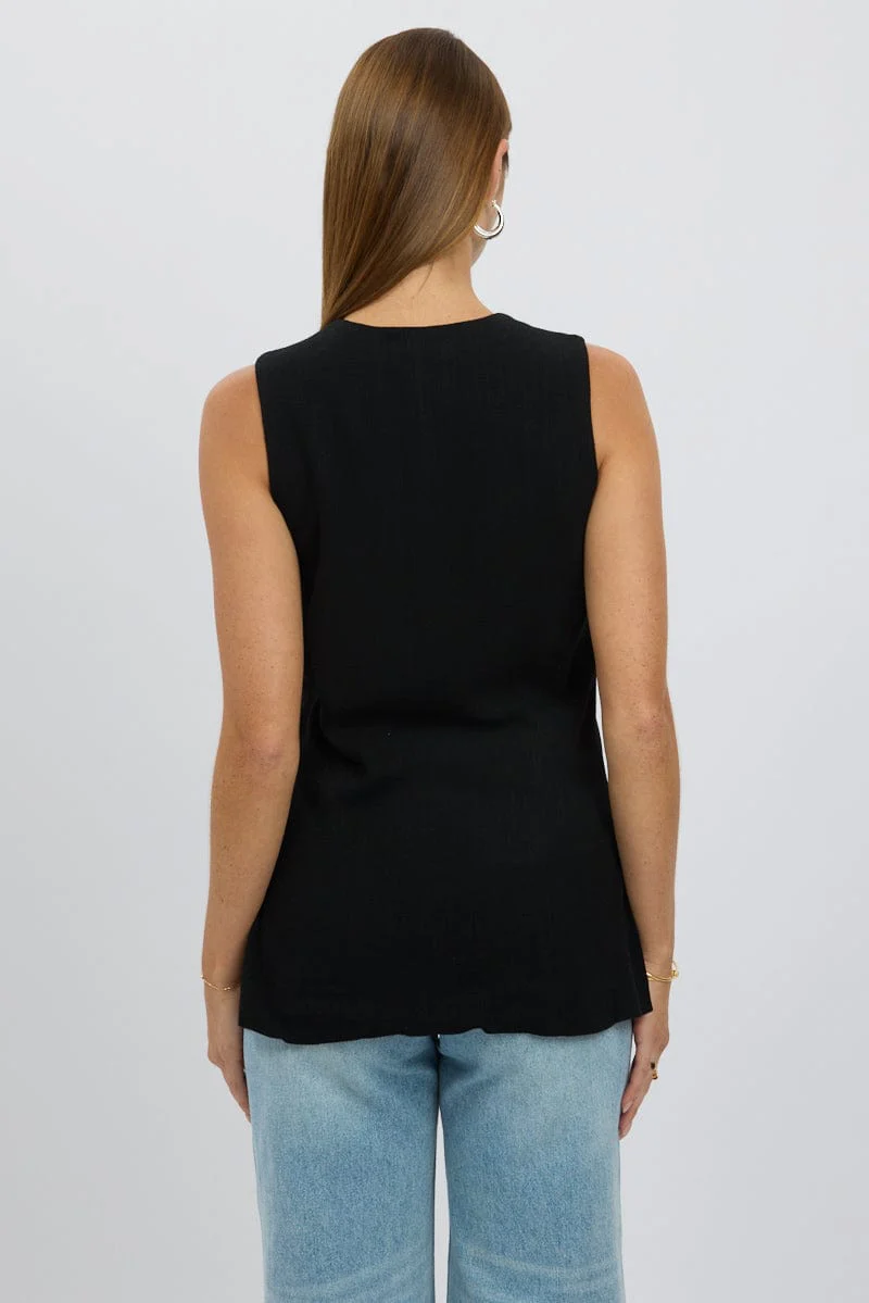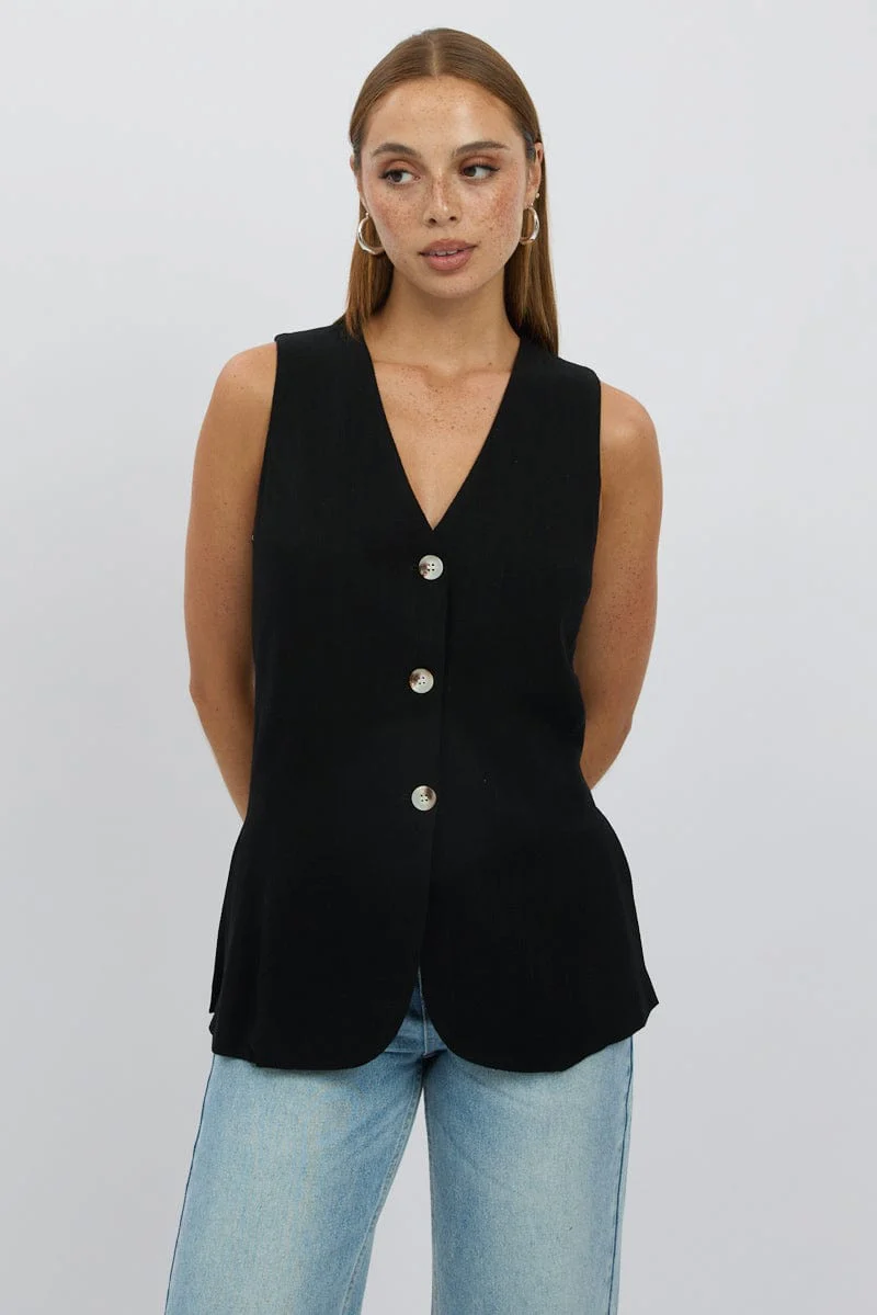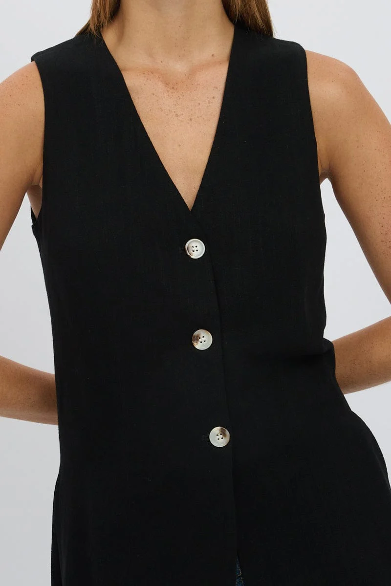 Black Linen Vest Longline V Neck