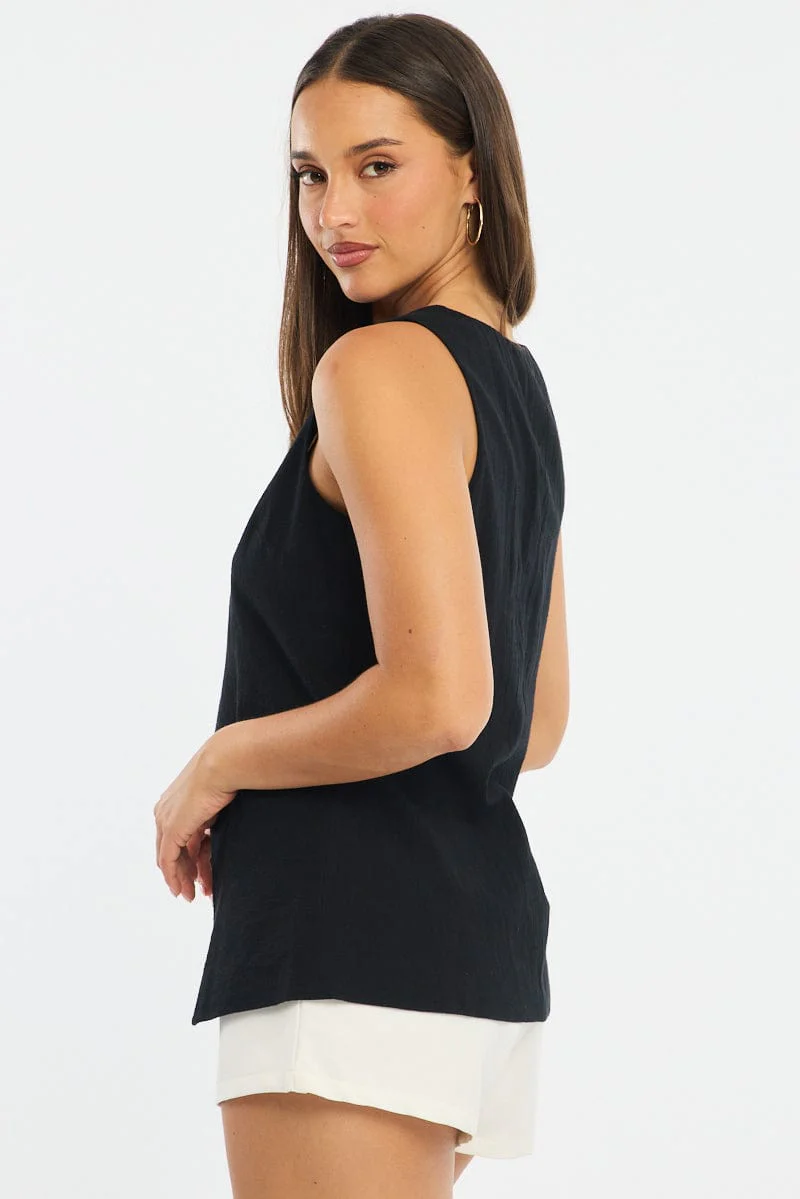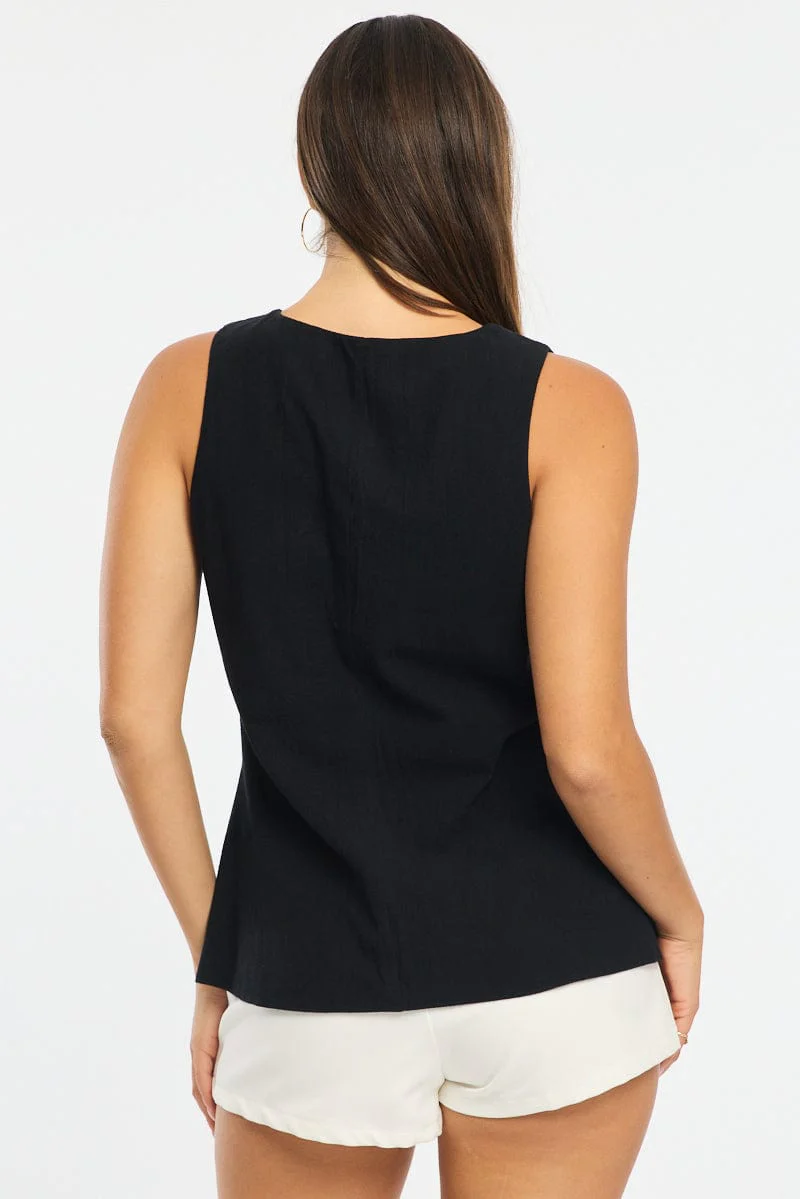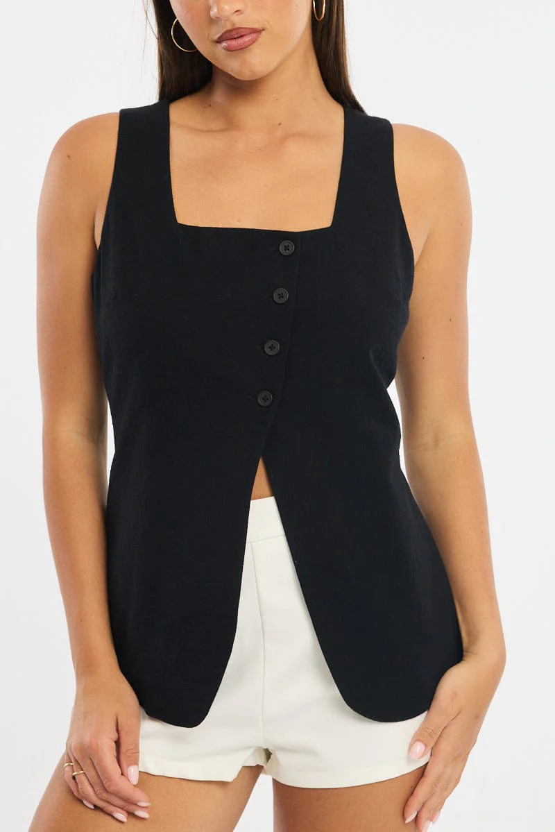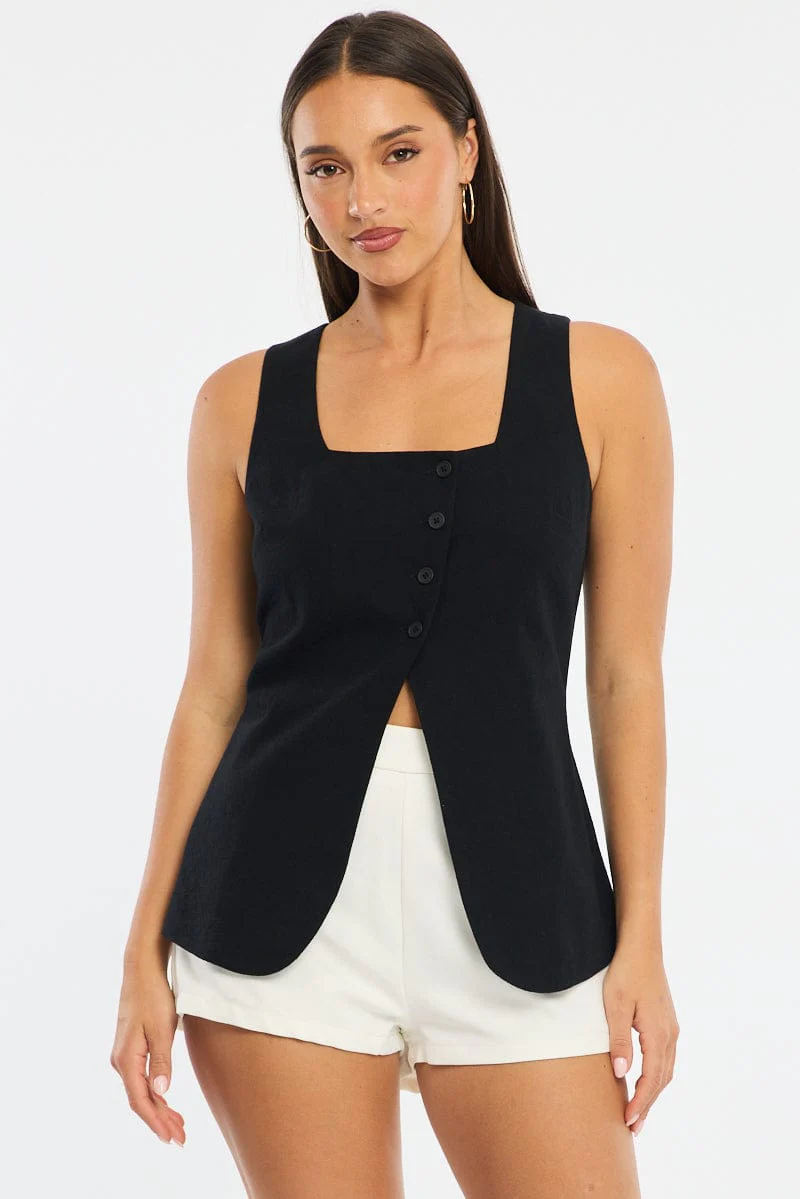 Black Linen Vest Longline V Neck