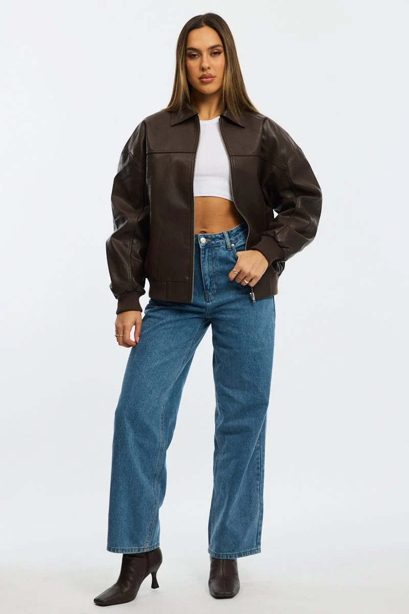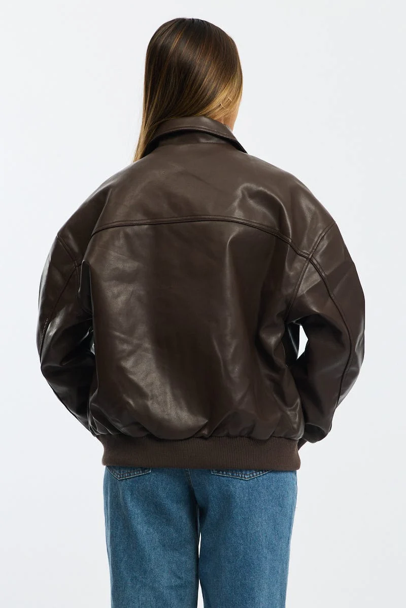 Brown Bomber Jacket Faux Leather