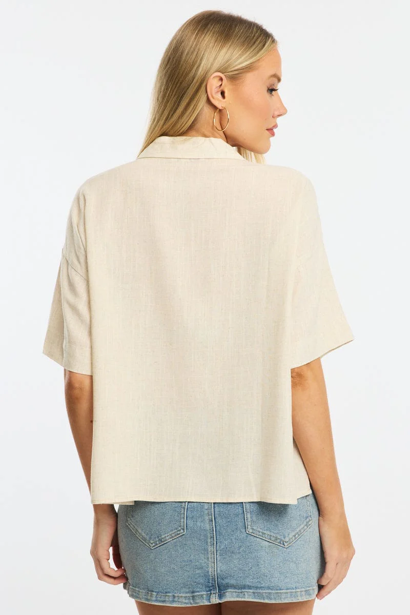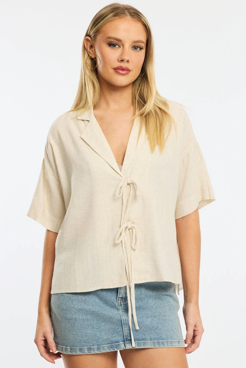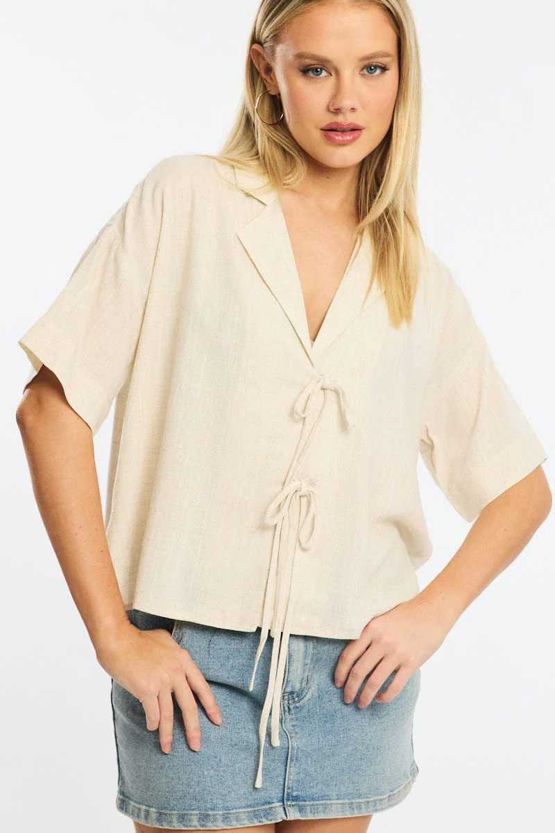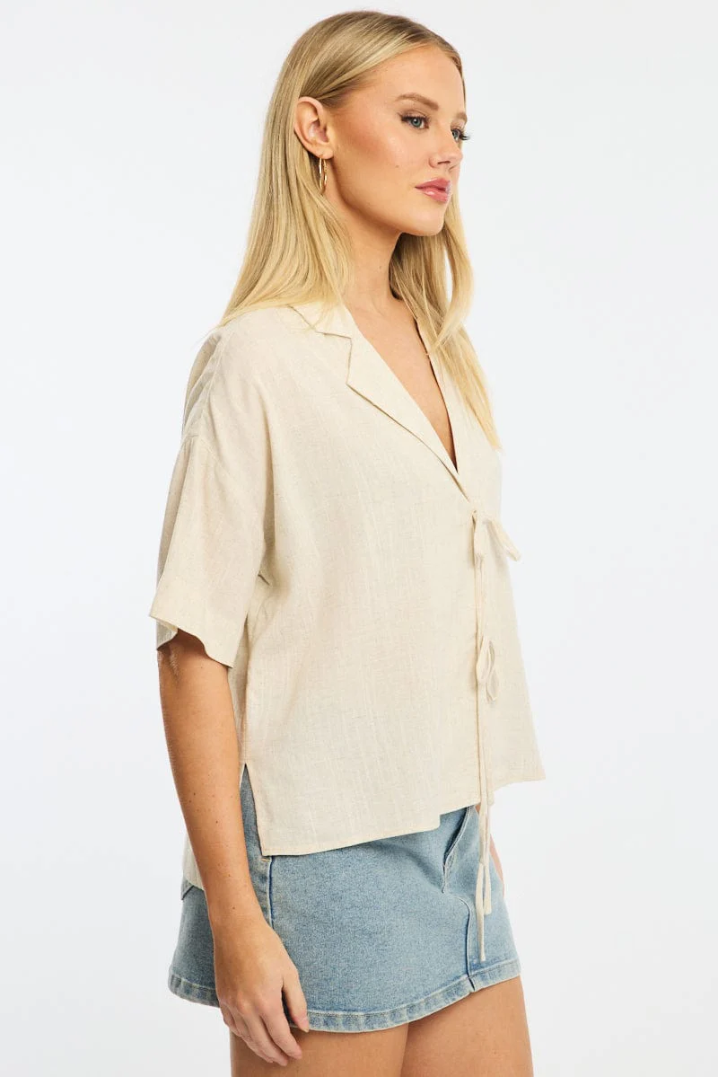 Beige Tie Up Top Short Sleeve