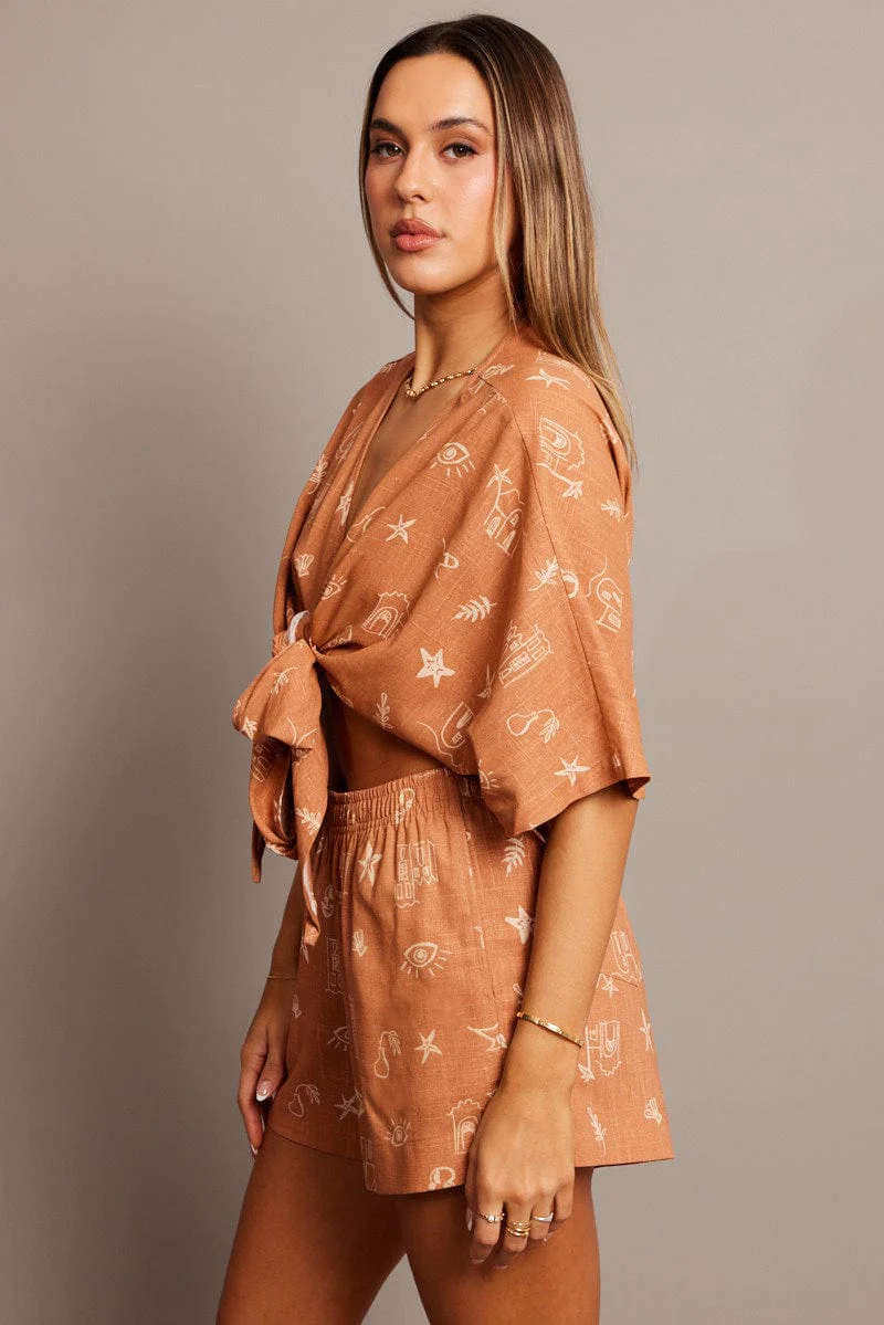 Brown Abstract Tie Up Bolero Short Sleeve