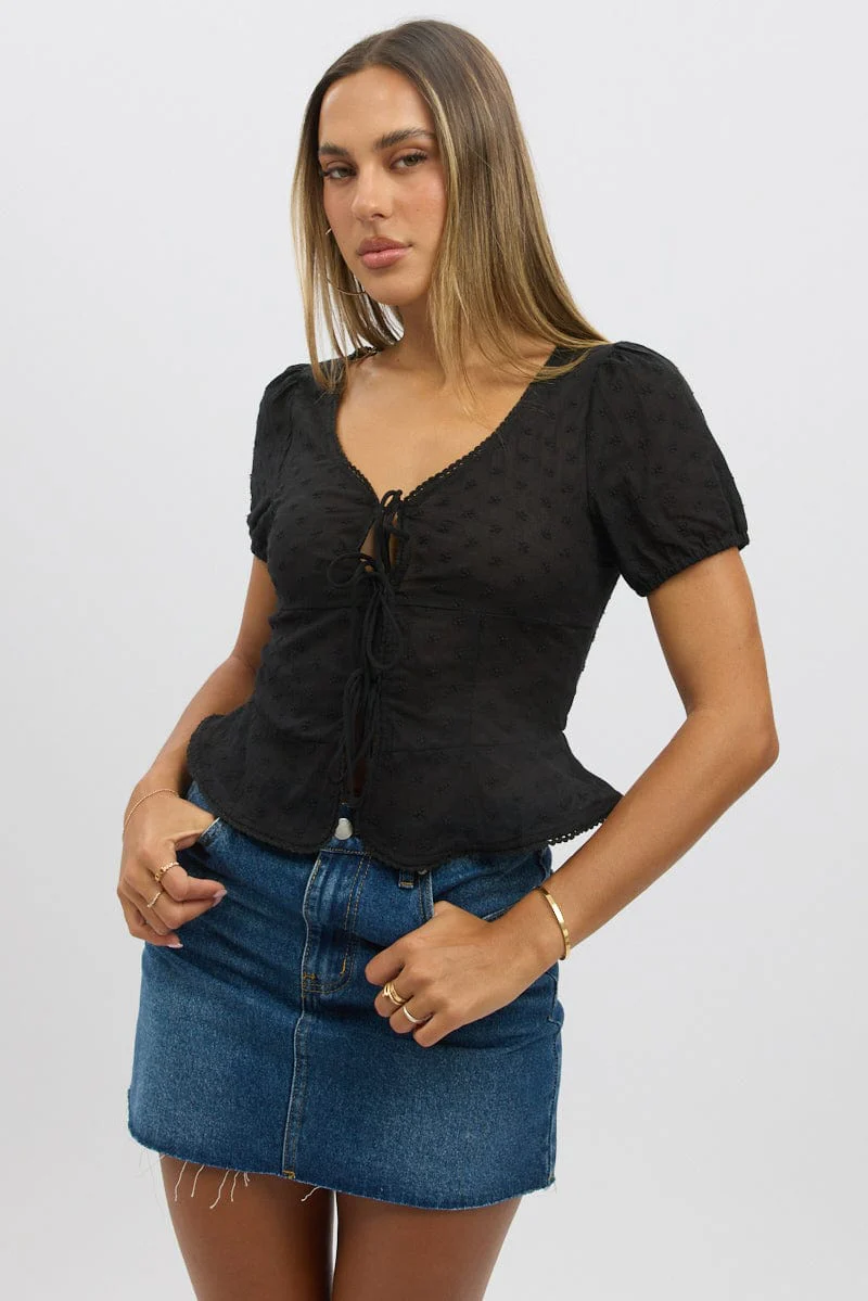 Black Tie Up Top Short Sleeve Eyelet