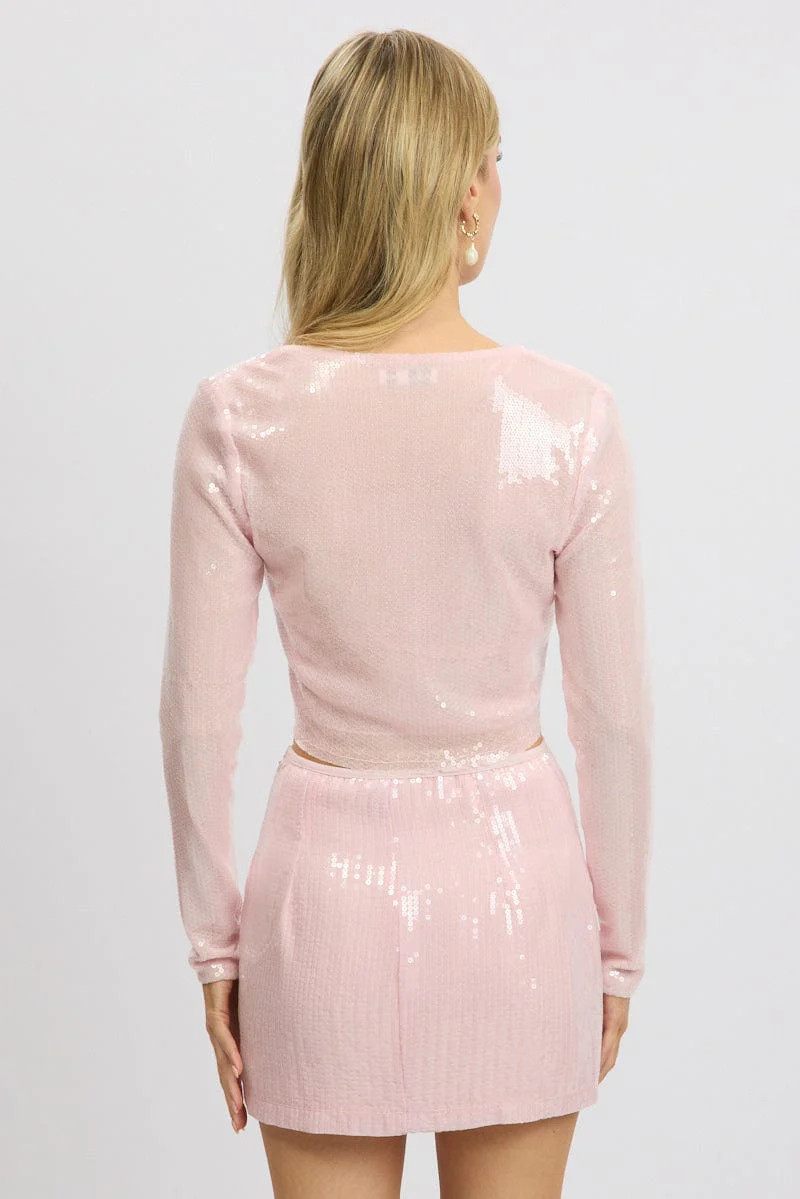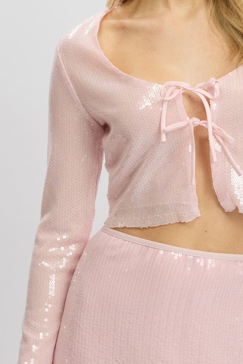 Pink Sequin Top Tie Up Front Long Sleeve