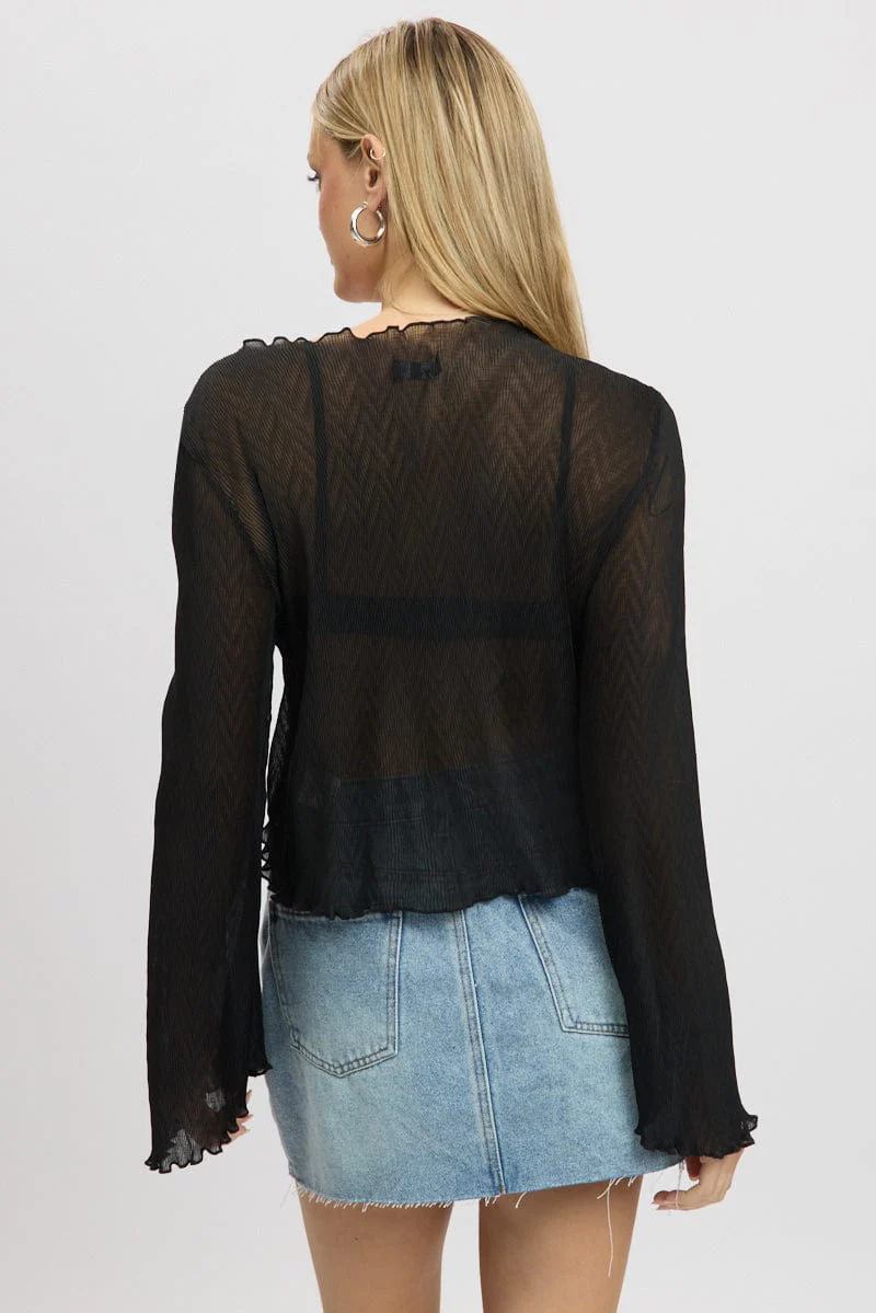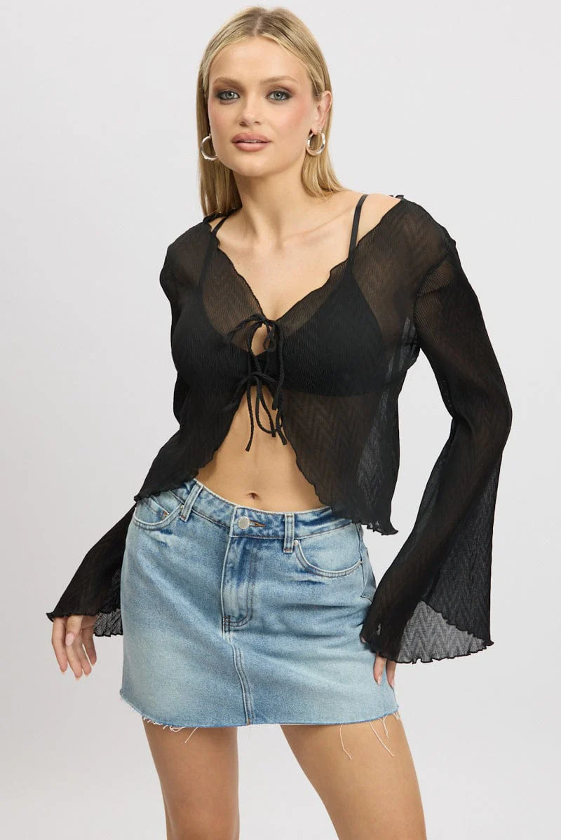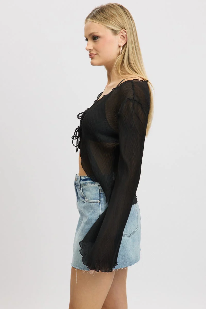 Black Tie Up Front Top Long Sleeve Textured