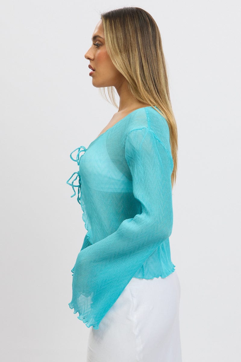 Blue Tie Up Front Top Long Sleeve Textured