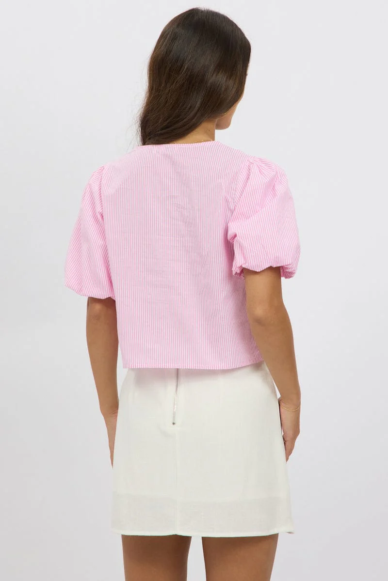 Pink Stripe Front Tie Top Puff Short Sleeve