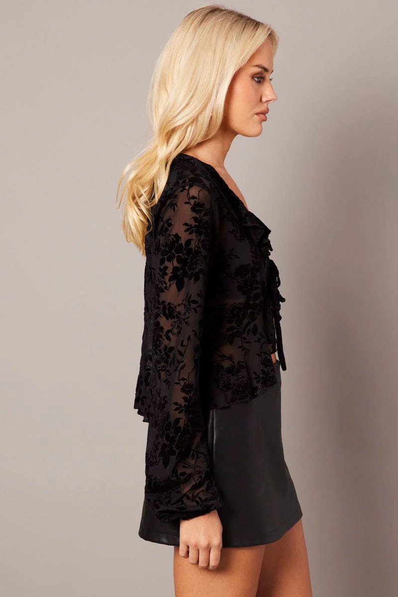 Black Ruffle Top Long Sleeve Burnout