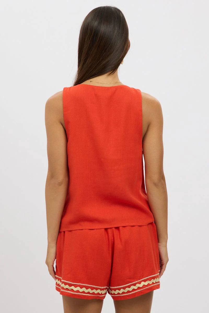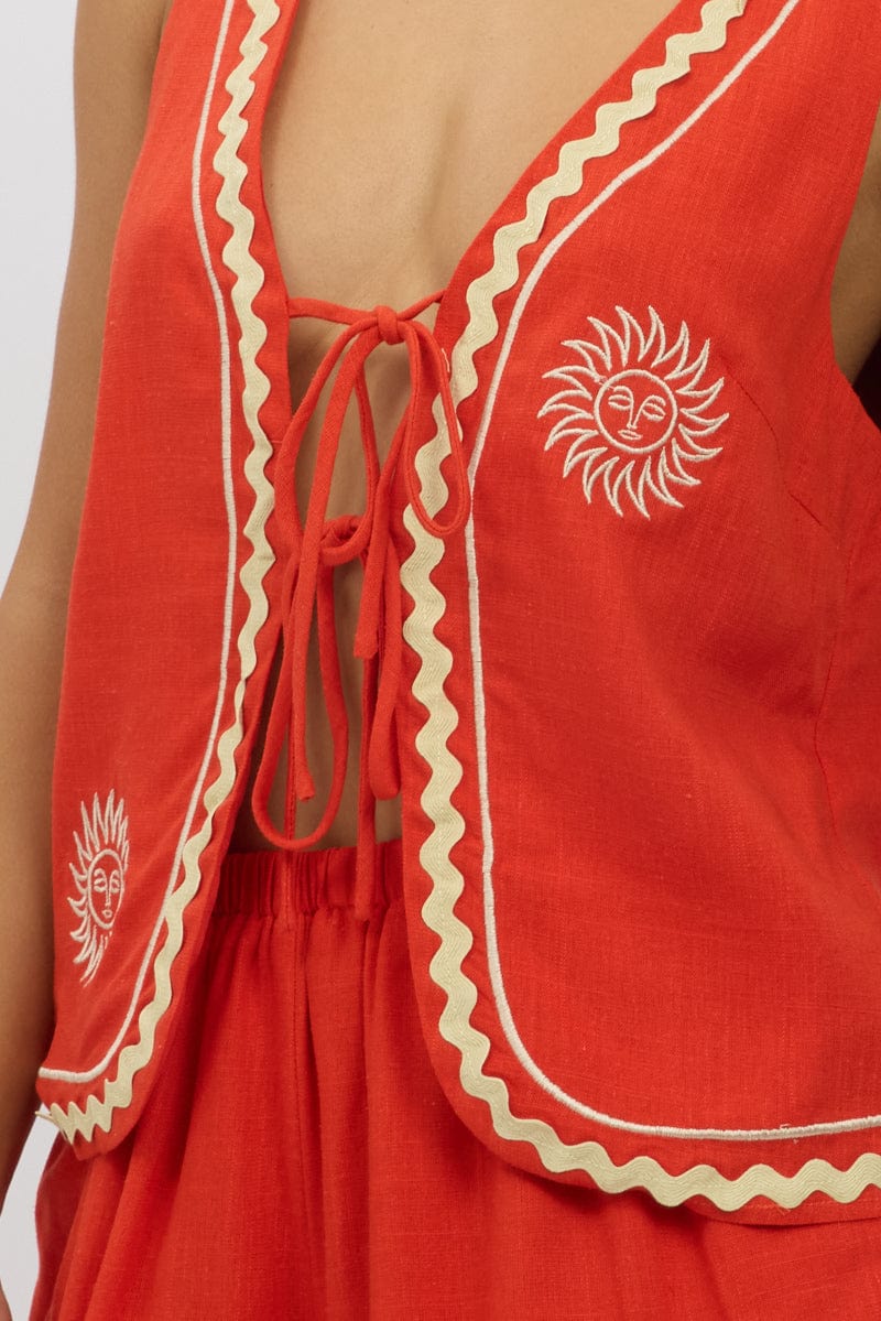 Red Linen Vest Sleeveless Embo