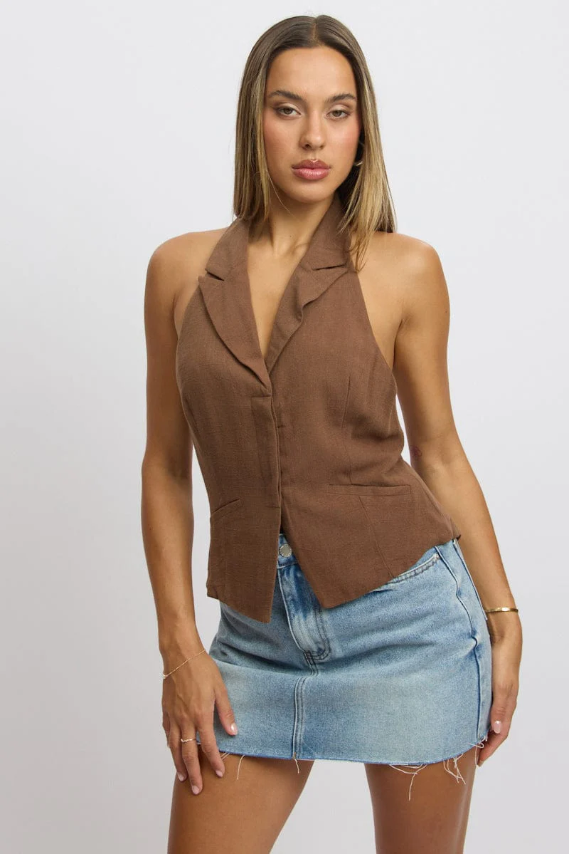 Brown Vest Top V Neck Halter Neck Open Back
