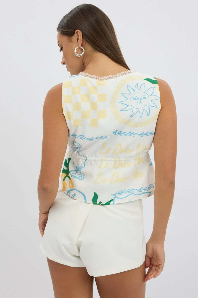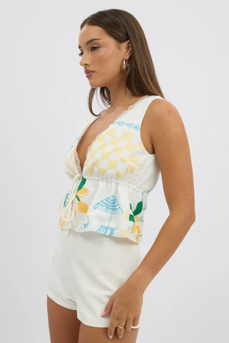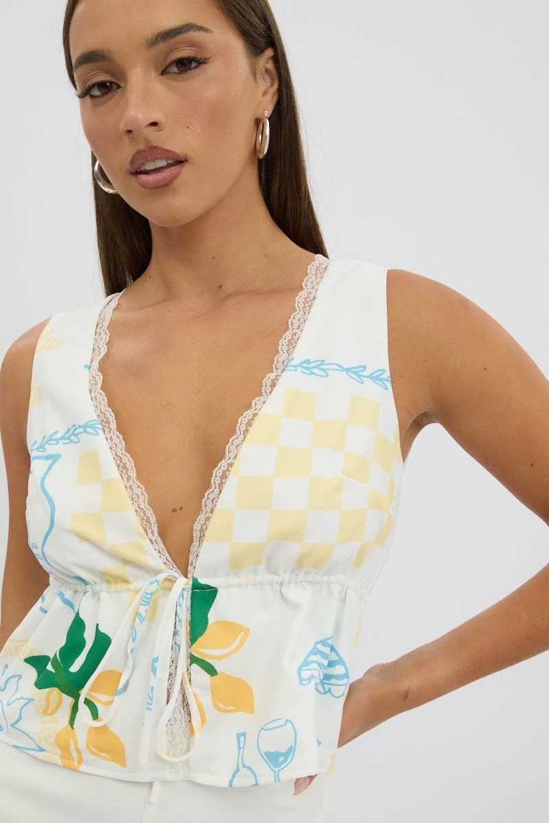 Yellow Abstract Tie Front Top