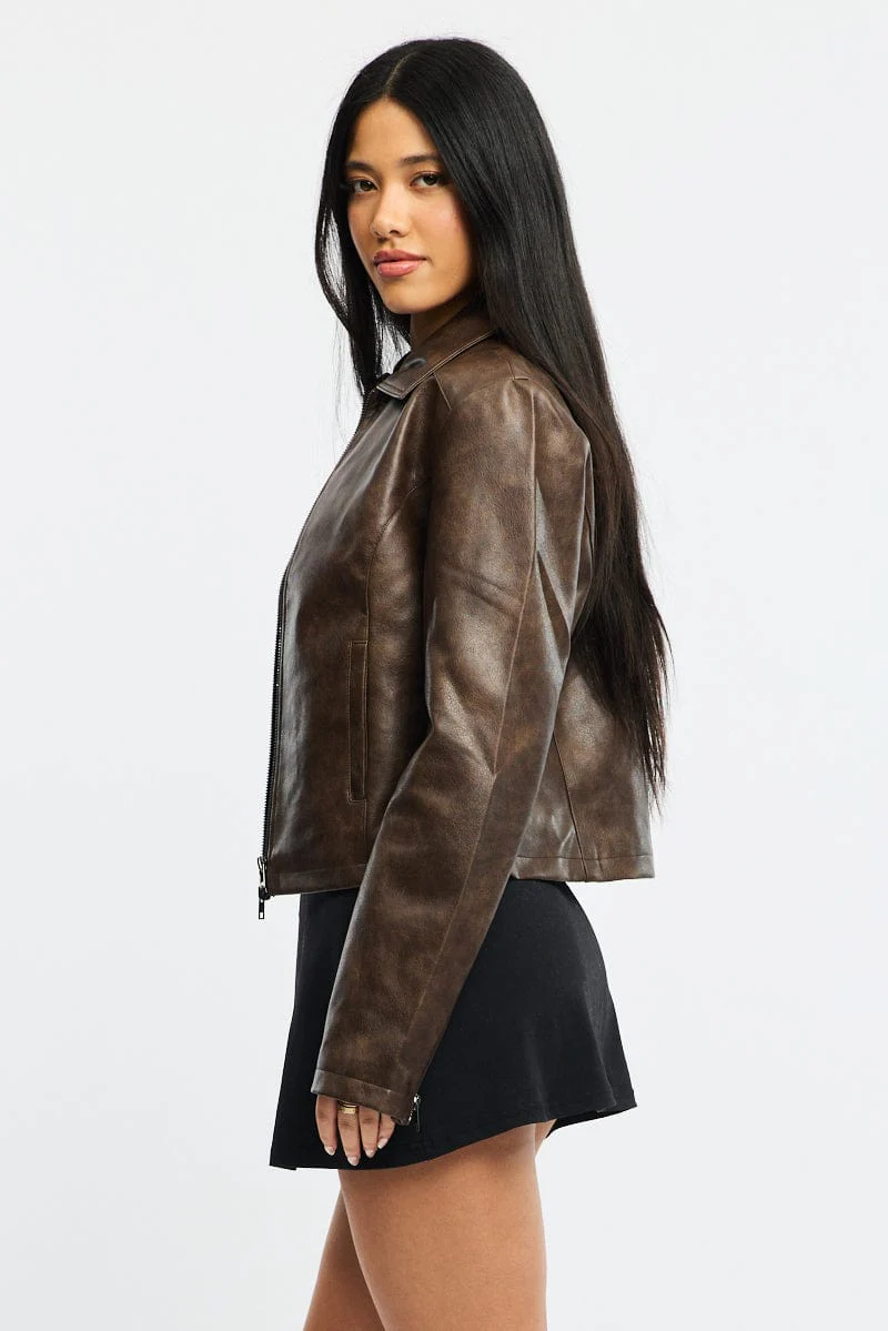 Brown Faux Leather Jacket Long Sleeve