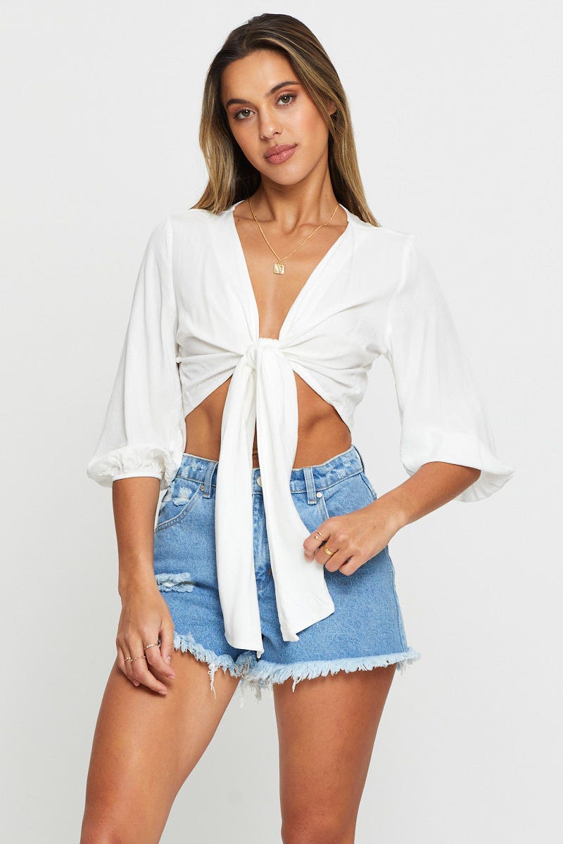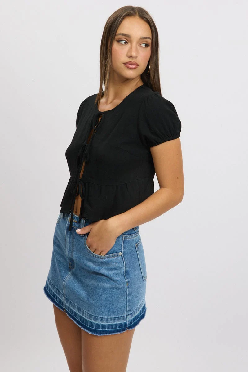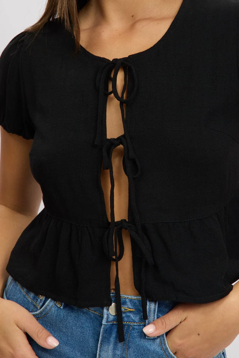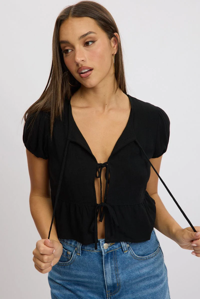Black Tie Front Top Puff Sleeve