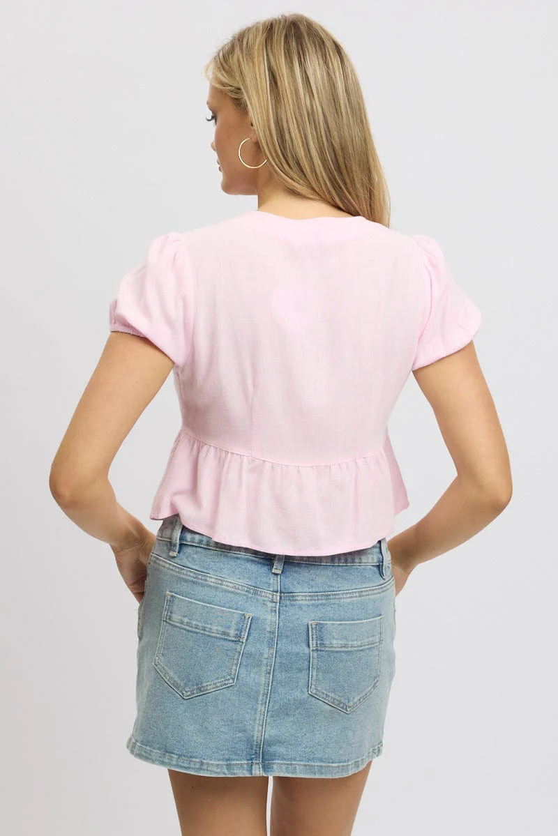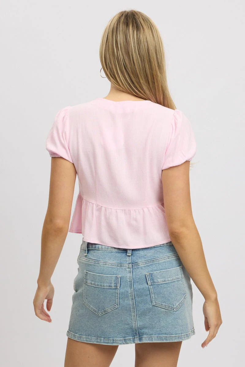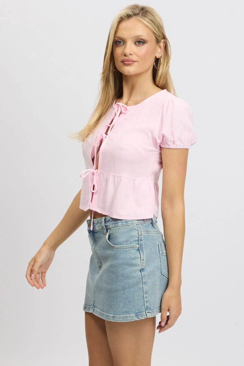 Pink Tie Front Top Puff Sleeve