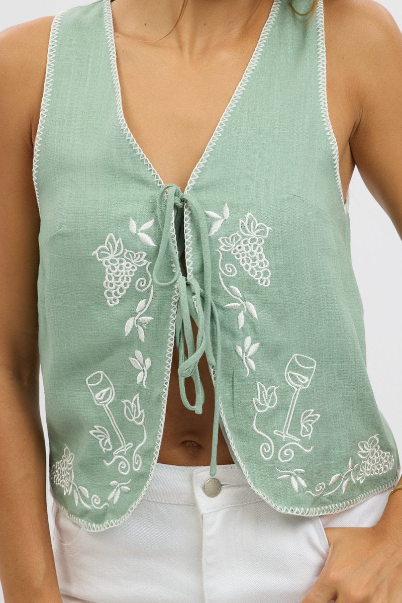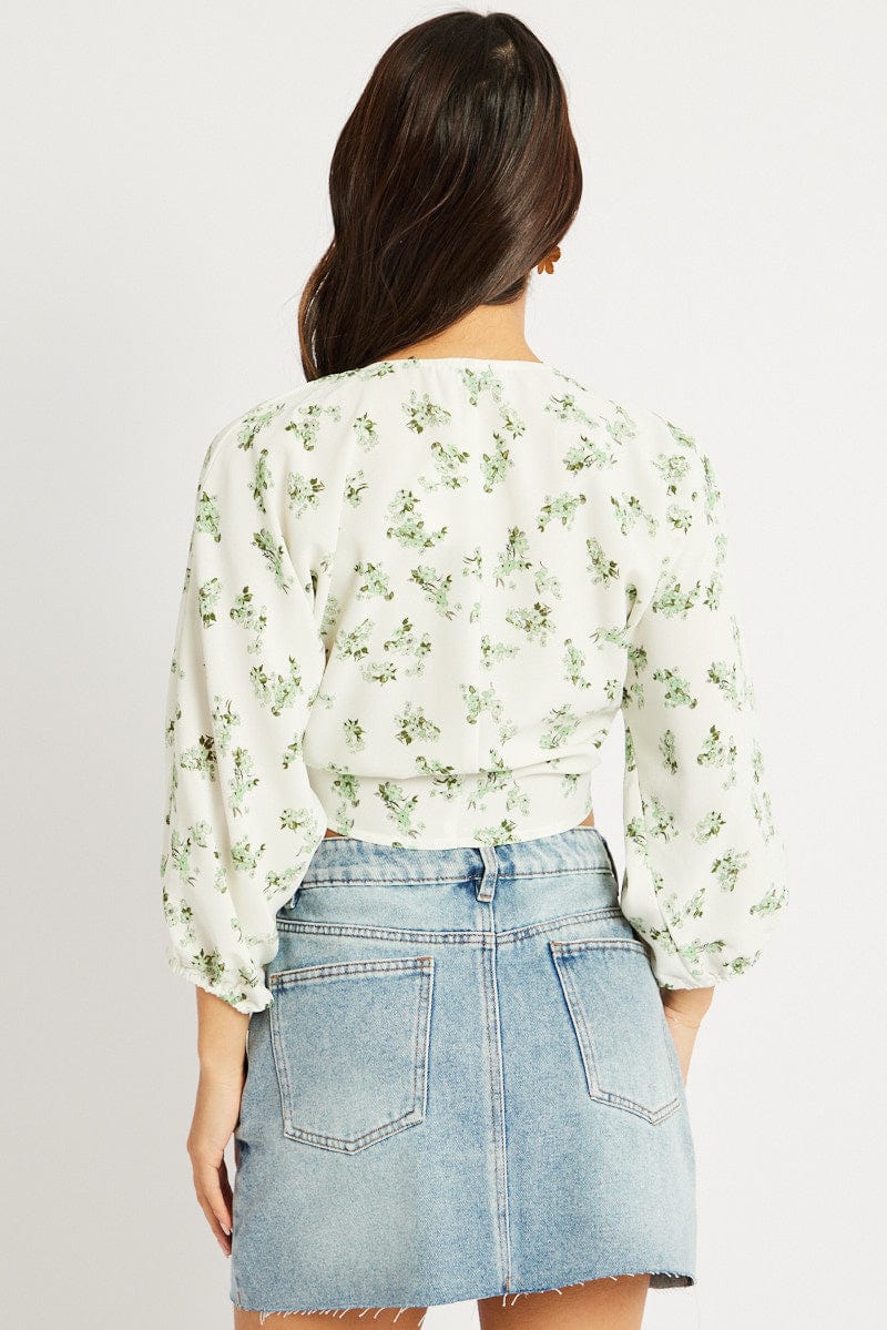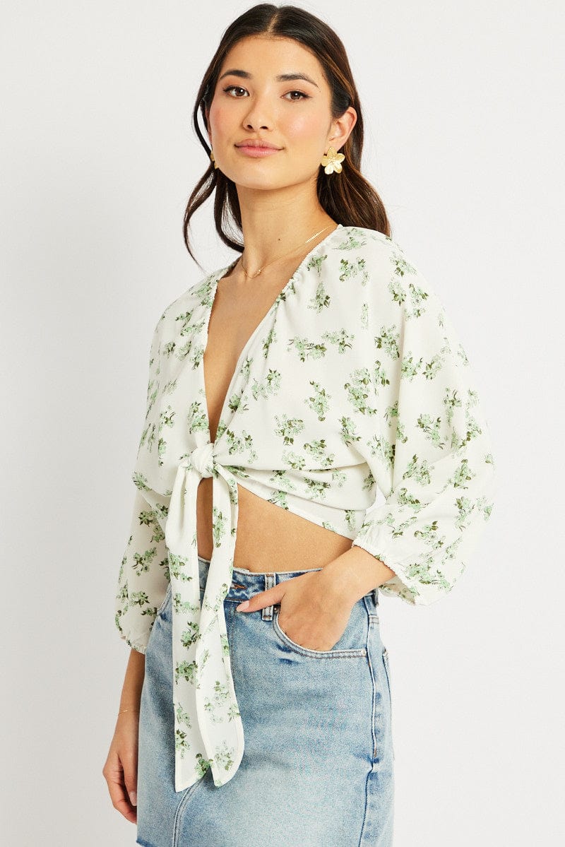 Green Floral Tie Front Bolero 3/4 Sleeve Crop