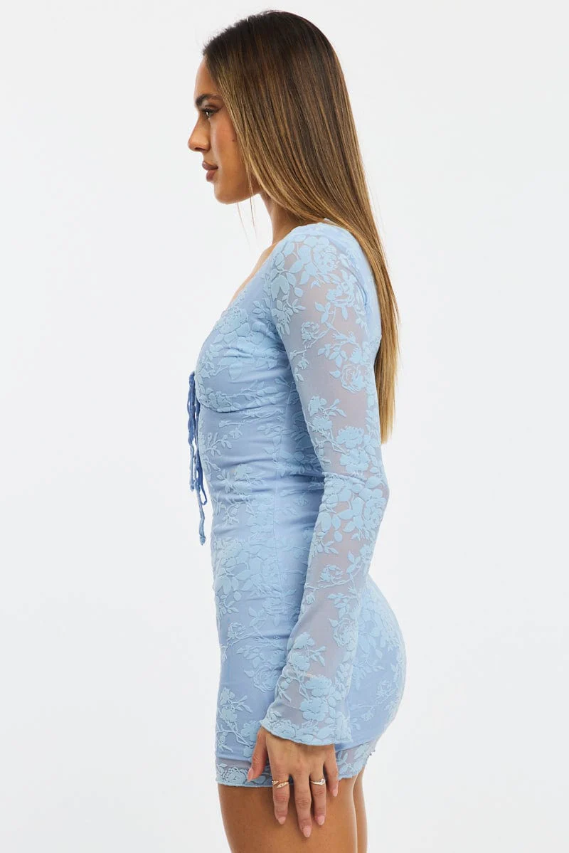 Blue Bodycon Dress Mini Long Sleeve Burnout