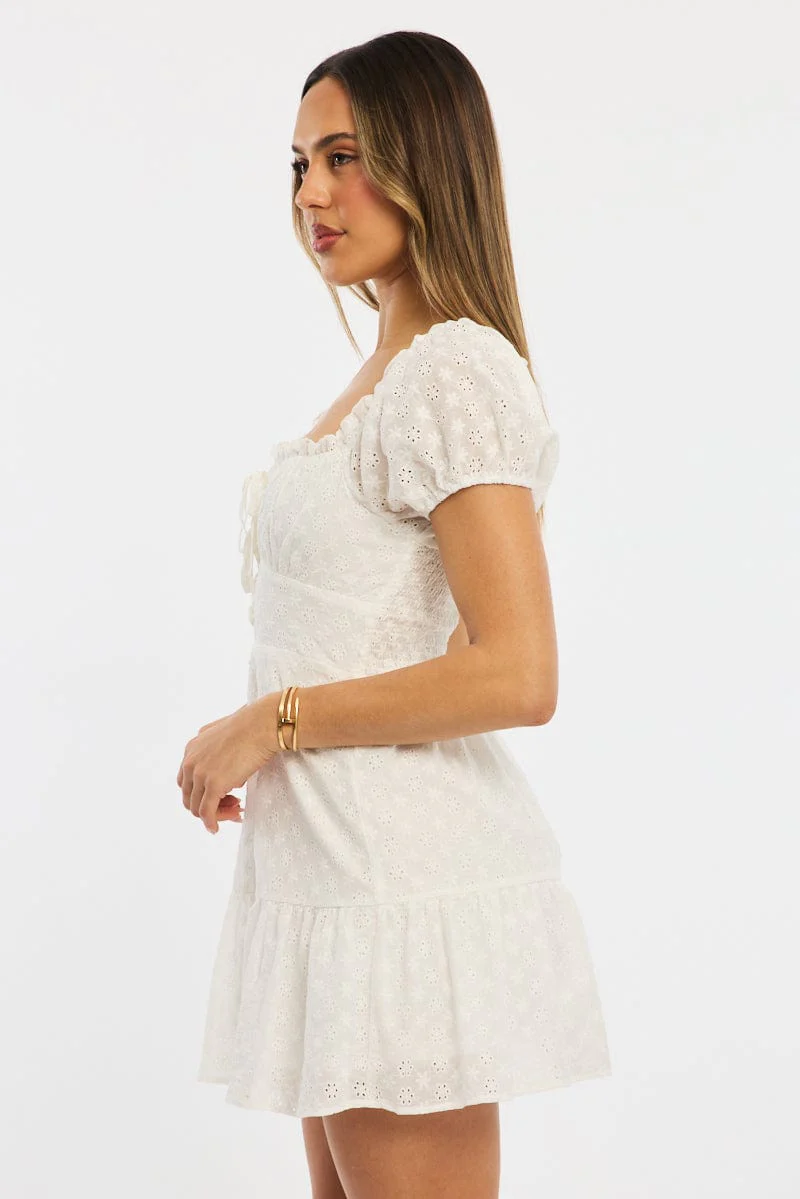 White Fit And Flare Dress Puff Sleeve Eyelet Fabric