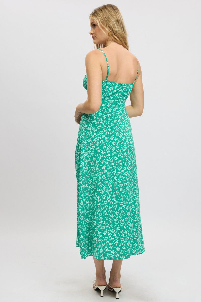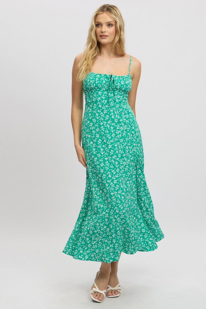 Green Ditsy Midi Dress Gathered Bust