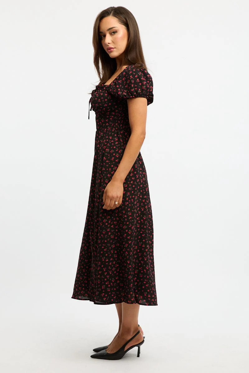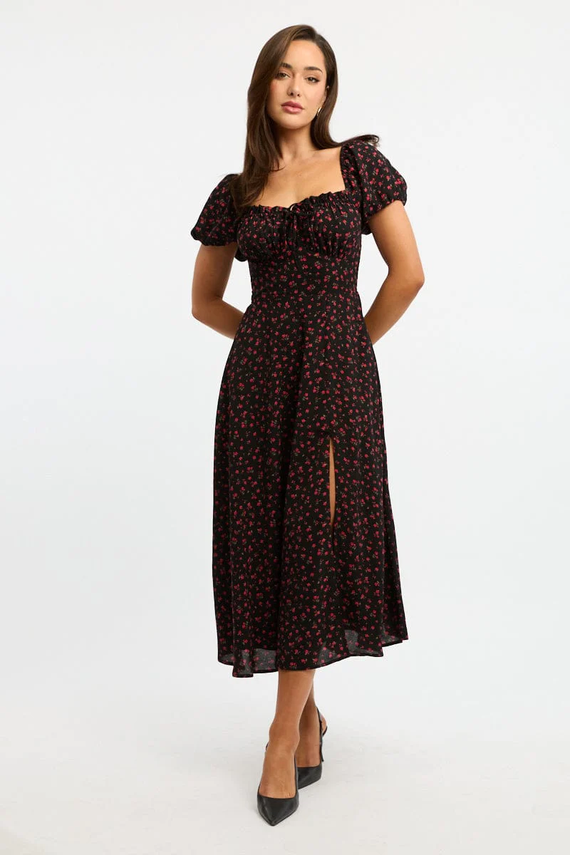 Black Ditsy Midi Dress Puff Sleeve