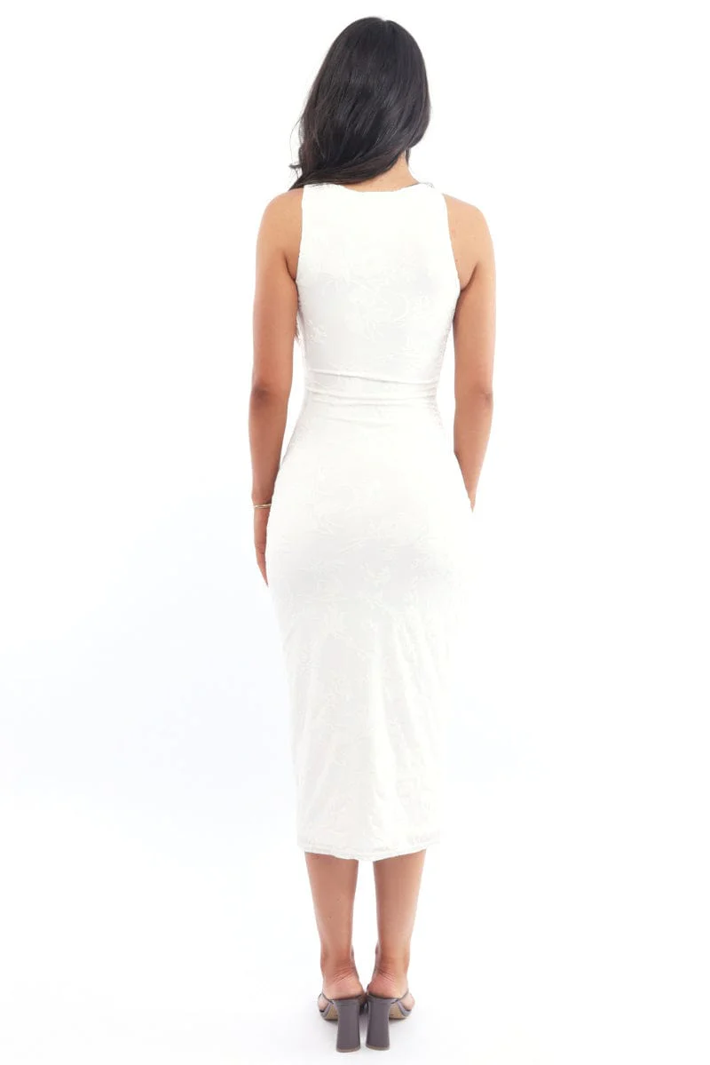 White Bodycon Dress Round Neck Sleeveless Burnout