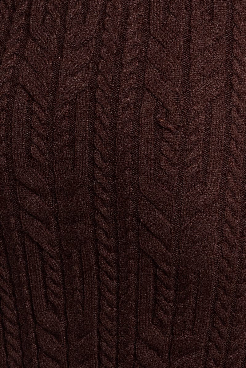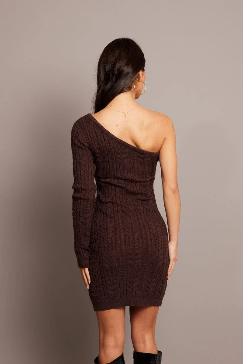 Brown One Shoulder Knitted Dress Long Sleeve