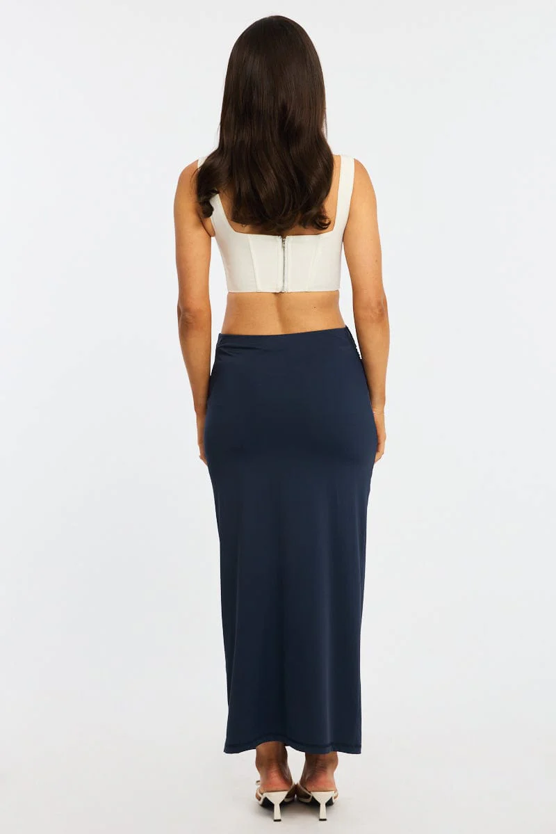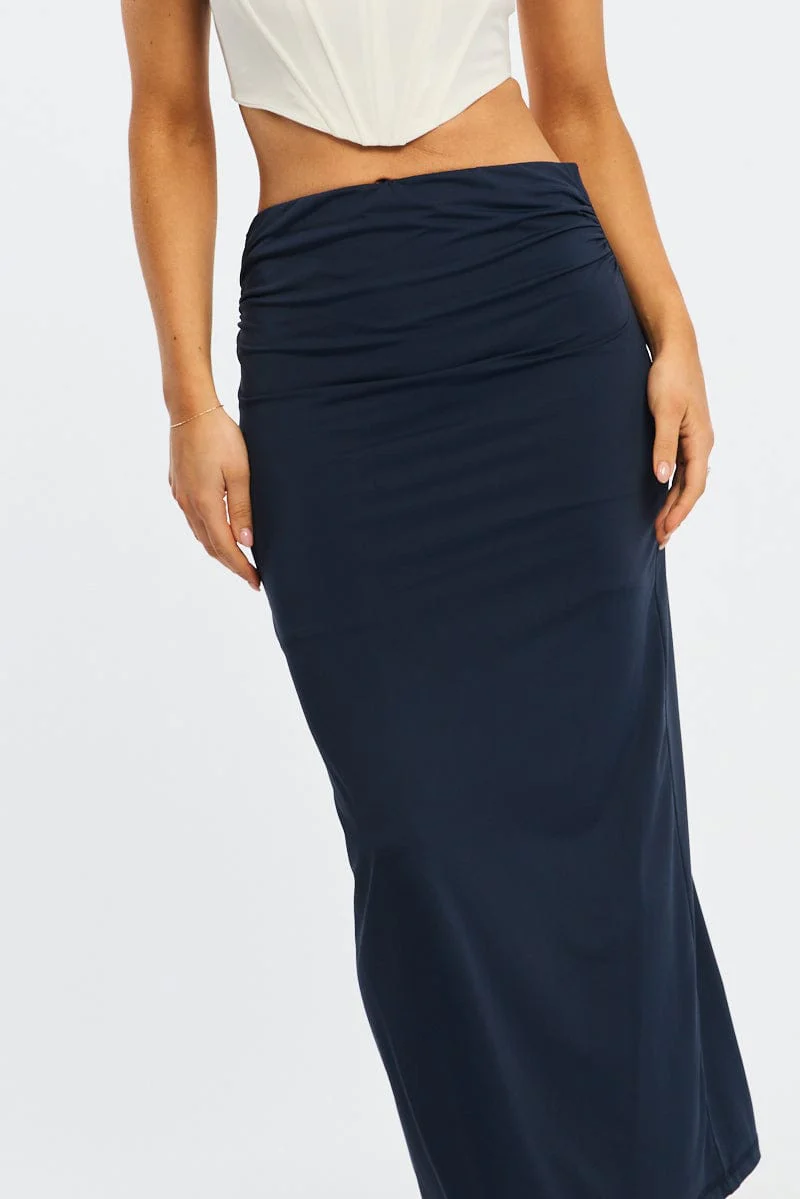 Blue Ruched Maxi Skirt Elastic Waist