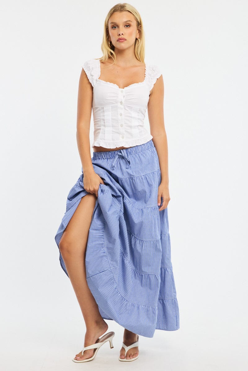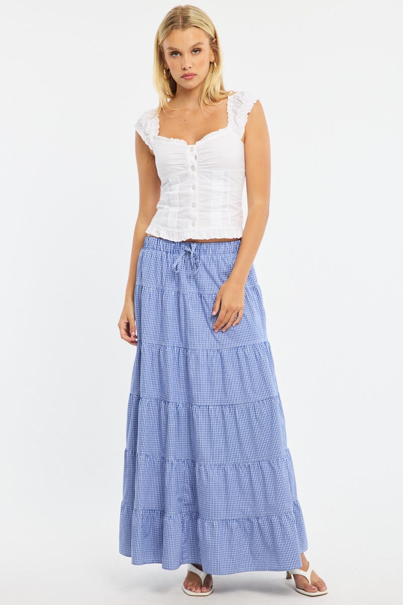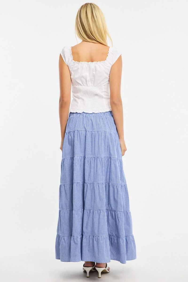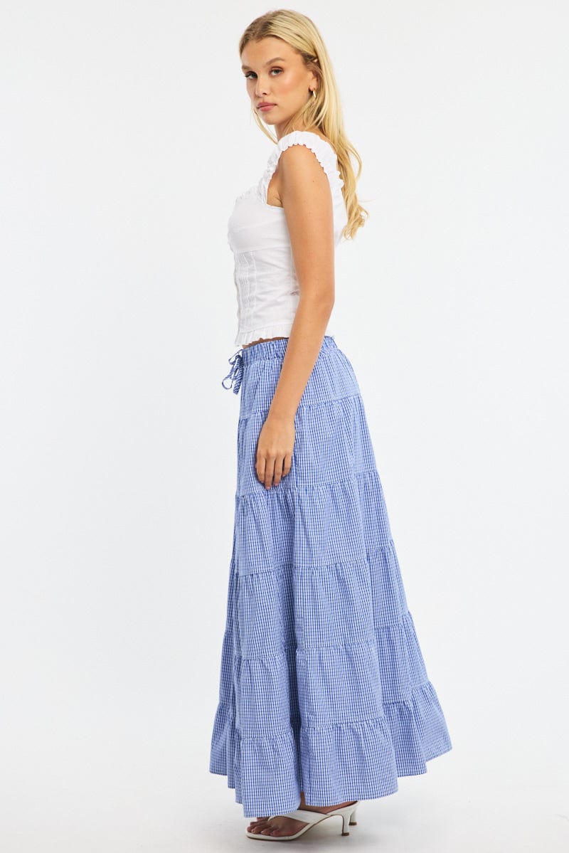 Blue Check Maxi Skirt Tiered High Rise Linen Blend