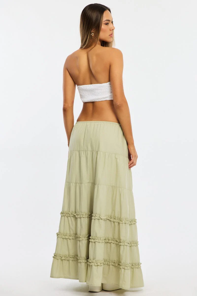 Green Maxi Skirt Elasticated Waist Tiered Frilled Detail