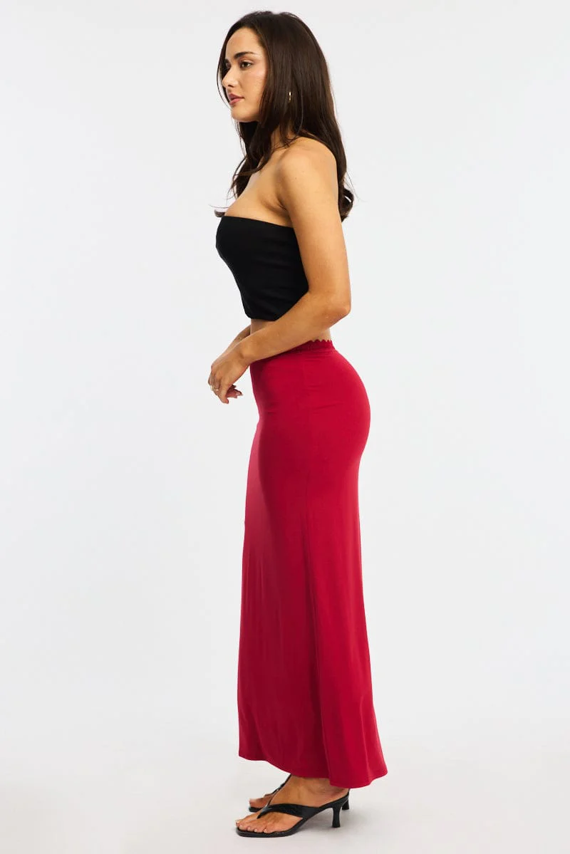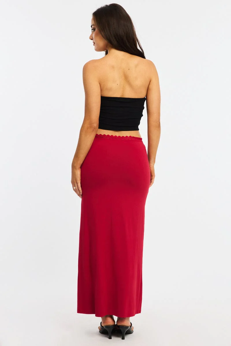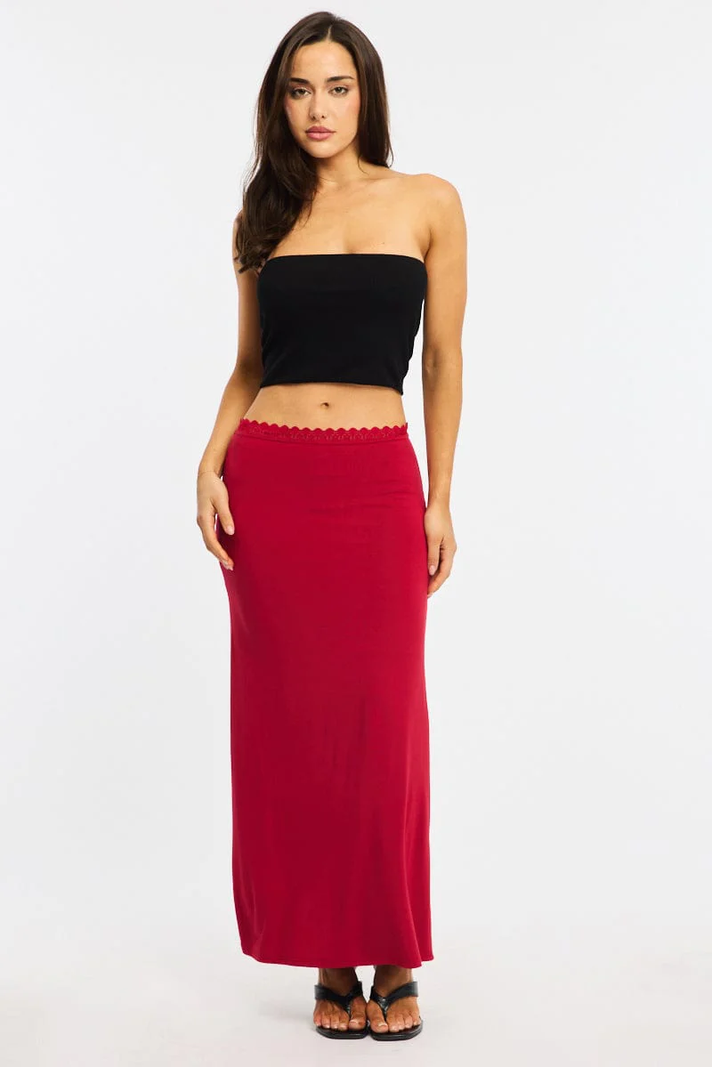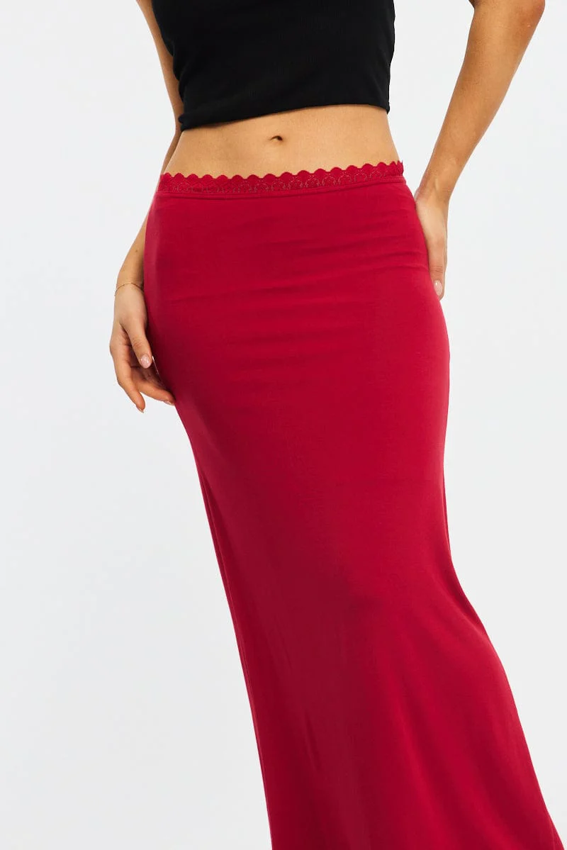 Red Maxi Skirt Elastic Waist Lace Trim Detail Lined