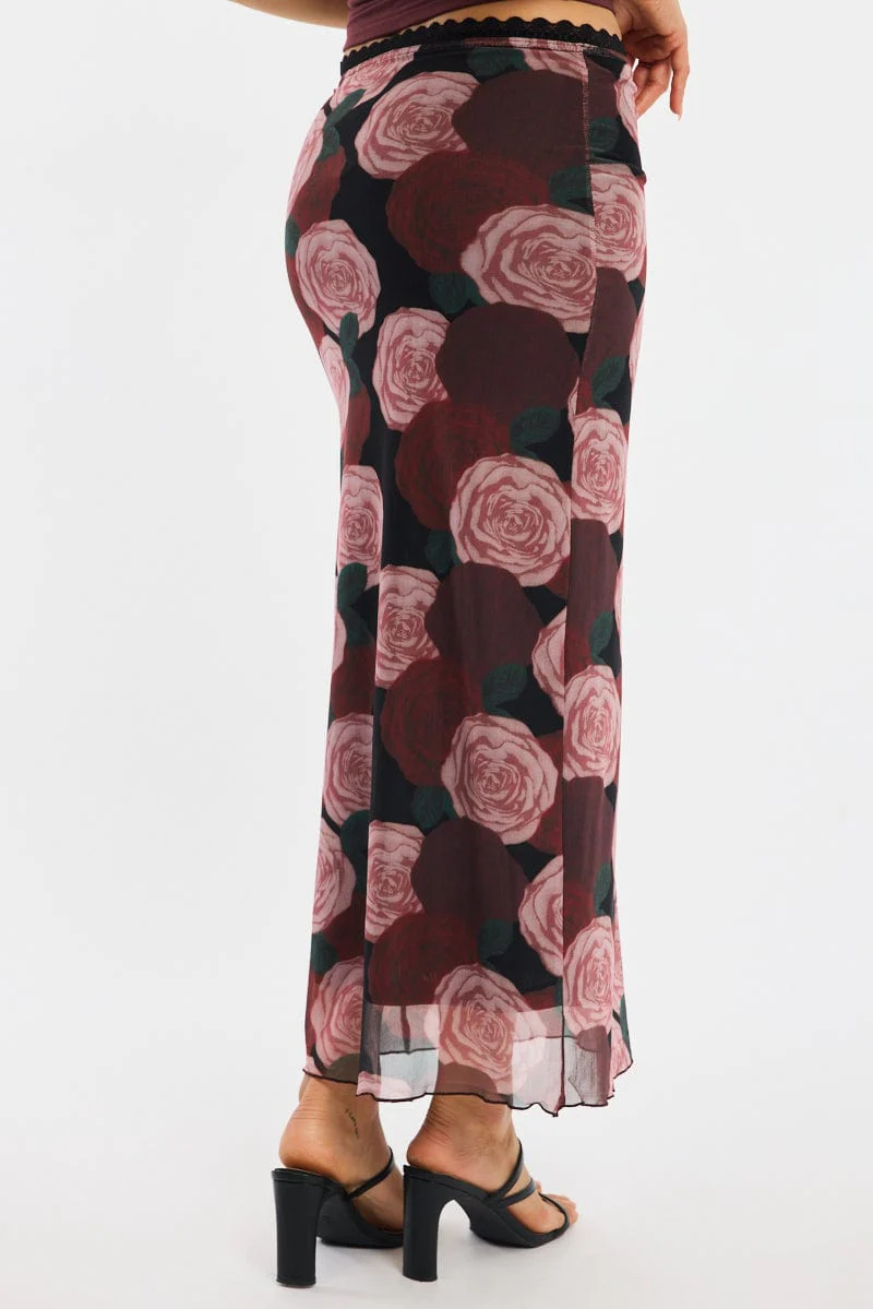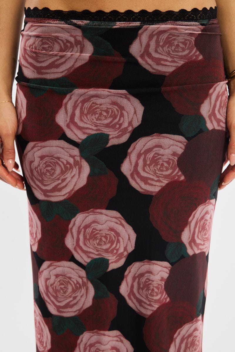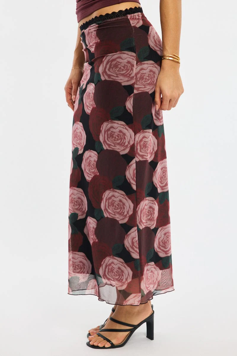 Black Floral Mesh Maxi Skirt Elastic Waist Lace Trim Detail