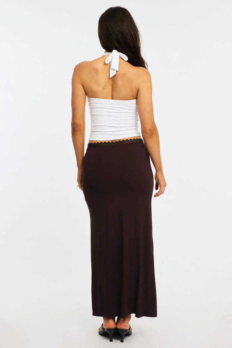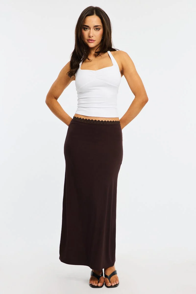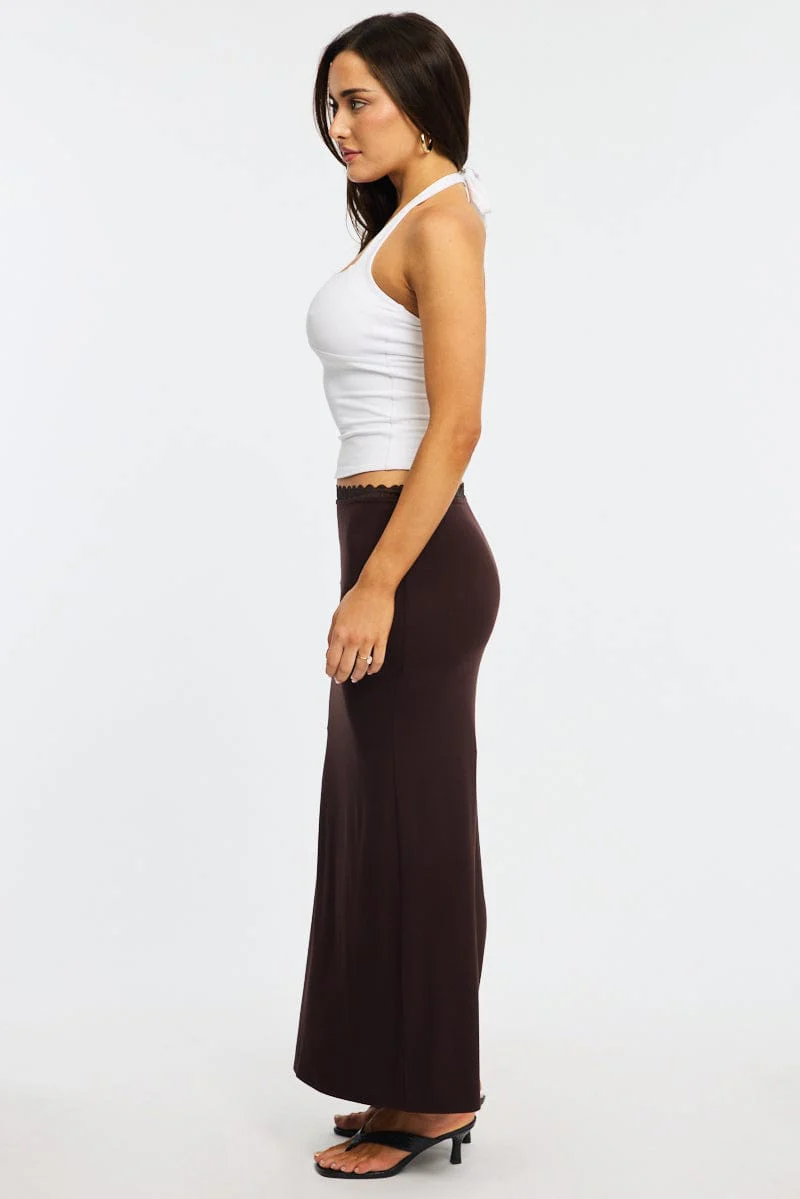 Brown Maxi Skirt Elastic Waist Lace Trim Detail Lined